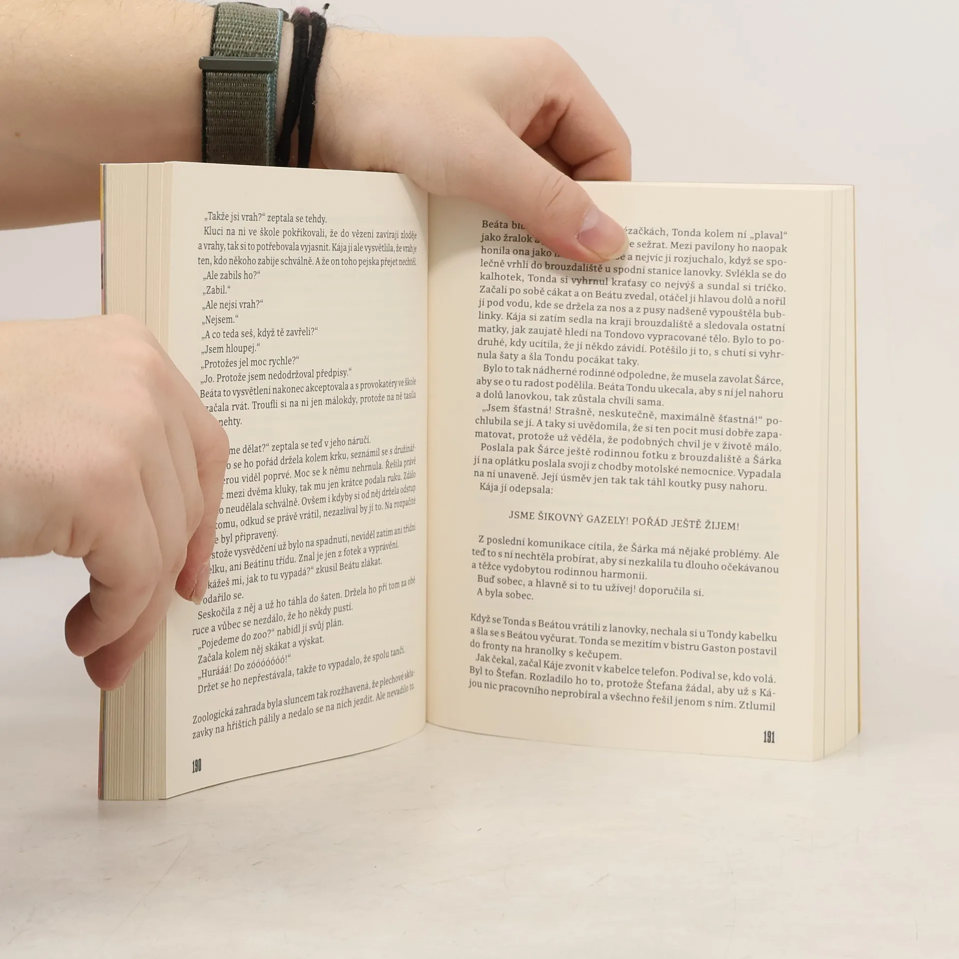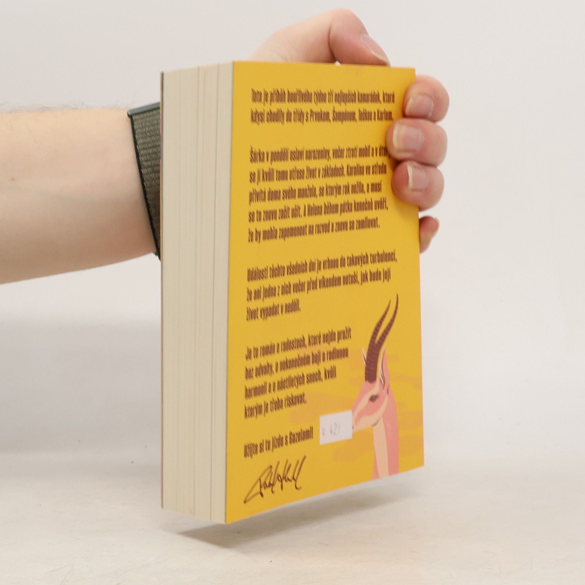 Gazely vypráví příběh jednoho bouřlivého týdne tří blízkých kamarádek, které kdysi chodily do školy s Prvokem, Šampónem, Tečkou a Karlem. Šárka začíná týden narozeninovou oslavou, ale ztráta mobilu jí už v úterý převrátí život naruby. Karolína se ve středu setkává se svým manželem, se kterým po roce odloučení zkouší obnovit vztah. Helena v pátek zjišťuje, že by mohla nechat rozvod za sebou a znovu najít lásku. Během těchto několika dní se jejich životy ocitnou ve víru změn, takže ani jedna z nich nemá tušení, jaké překvapení je čeká do neděle. Tento román je o radosti, která vyžaduje odvahu, o neustálém úsilí najít rovnováhu v rodině a o snech z mládí, kvůli kterým stojí za to riskovat.
