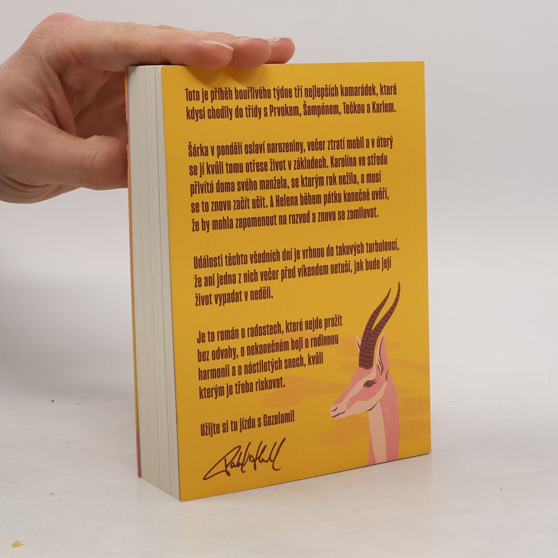 Gazely vypráví příběh jednoho bouřlivého týdne tří blízkých kamarádek, které kdysi chodily do školy s Prvokem, Šampónem, Tečkou a Karlem. Šárka začíná týden narozeninovou oslavou, ale ztráta mobilu jí už v úterý převrátí život naruby. Karolína se ve středu setkává se svým manželem, se kterým po roce odloučení zkouší obnovit vztah. Helena v pátek zjišťuje, že by mohla nechat rozvod za sebou a znovu najít lásku. Během těchto několika dní se jejich životy ocitnou ve víru změn, takže ani jedna z nich nemá tušení, jaké překvapení je čeká do neděle. Tento román je o radosti, která vyžaduje odvahu, o neustálém úsilí najít rovnováhu v rodině a o snech z mládí, kvůli kterým stojí za to riskovat.