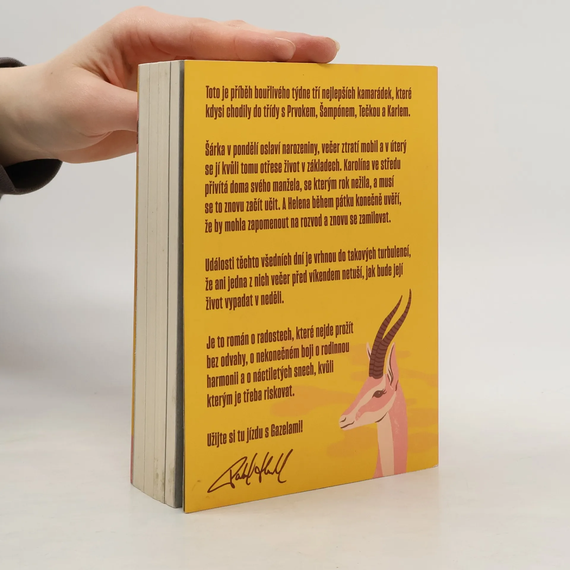 Gazely vypráví příběh jednoho bouřlivého týdne tří blízkých kamarádek, které kdysi chodily do školy s Prvokem, Šampónem, Tečkou a Karlem. Šárka začíná týden narozeninovou oslavou, ale ztráta mobilu jí už v úterý převrátí život naruby. Karolína se ve středu setkává se svým manželem, se kterým po roce odloučení zkouší obnovit vztah. Helena v pátek zjišťuje, že by mohla nechat rozvod za sebou a znovu najít lásku. Během těchto několika dní se jejich životy ocitnou ve víru změn, takže ani jedna z nich nemá tušení, jaké překvapení je čeká do neděle. Tento román je o radosti, která vyžaduje odvahu, o neustálém úsilí najít rovnováhu v rodině a o snech z mládí, kvůli kterým stojí za to riskovat.