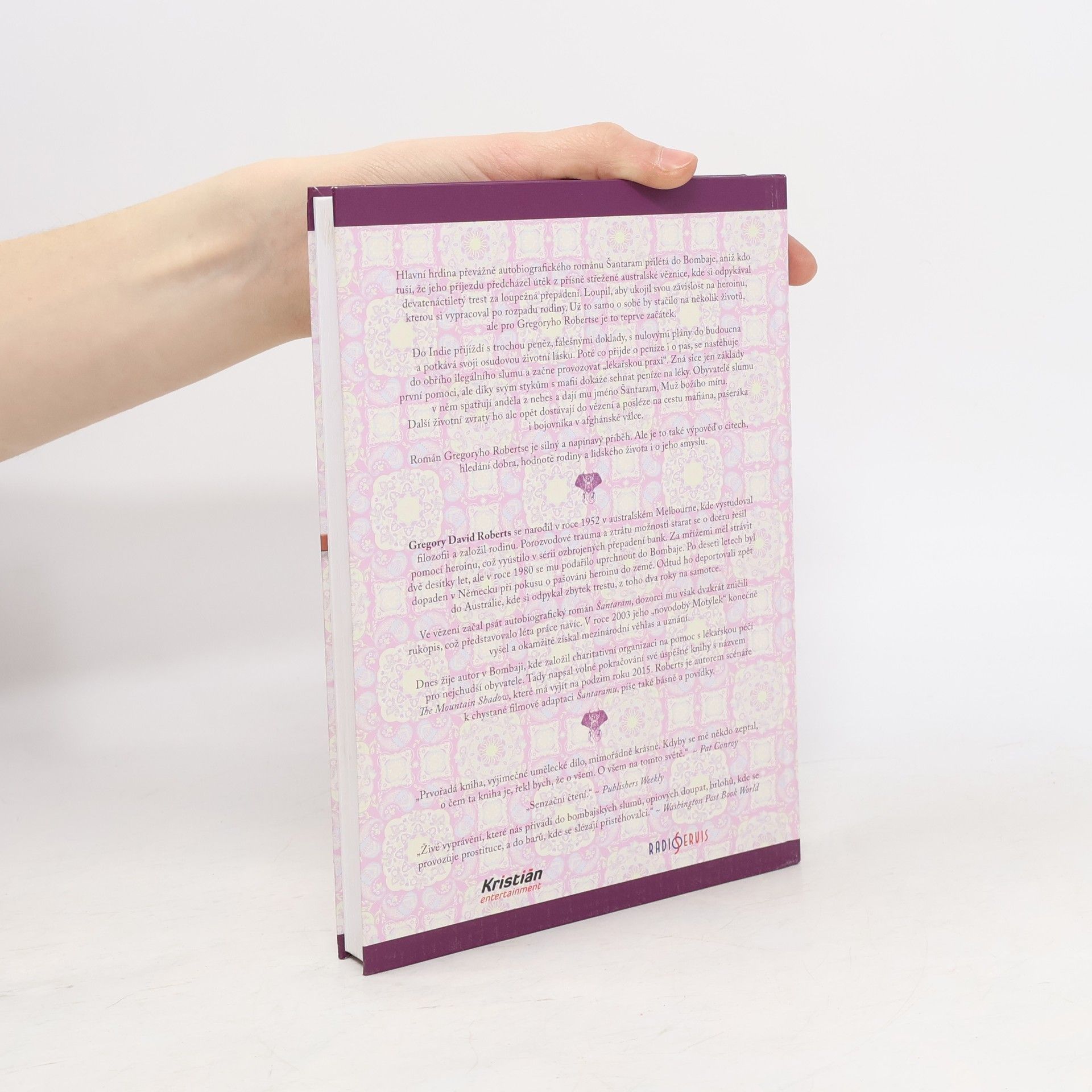 Hlavní hrdina převážně autobiografického románu Šantaram přilétá do Bombaje, aniž kdo tuší, že jeho příjezdu předcházel útěk z přísně střežené australské věznice, kde si odpykával devatenáctiletý trest za loupežná přepadení. Loupil, aby ukojil svou závislost na heroinu, kterou si vypracoval po rozpadu rodiny. V Bombaji získává přátele, kteří mu pomohou zorientovat se v tamějším životě, ale další životní zvraty ho opět dostávají do vězení a posléze na cestu mafiána, pašeráka i bojovníka v afghánské válce. Román Šantaram je silný a napínavý příběh. Ale je to také výpověď o citech, hledání dobra, hodnotě rodiny a lidského života i jeho smyslu. Kniha je také označována jako „novodobý Motýlek“ a po vydání okamžitě získala mezinárodní věhlas a uznání. Filmová práva vlastní Johny Depp, v roce 2016 je očekávána premiéra filmu. Gregory David Roberts, který v románu popsal své vlastní zážitky, dnes žije v Bombaji, kde založil charitativní organizaci zajišťující lékařskou péči pro nejchudší obyvatele. Tady napsal i volné pokračování své úspěšné knihy s názvem The Mountain Shadow, která má vyjít letos na podzim. Kniha, jež právě vychází v češtině, je kvůli čtenářskému komfortu rozdělená do tří samostatných oddílů, ale speciální obal z ní činí jeden celek se společným hřbetem.
