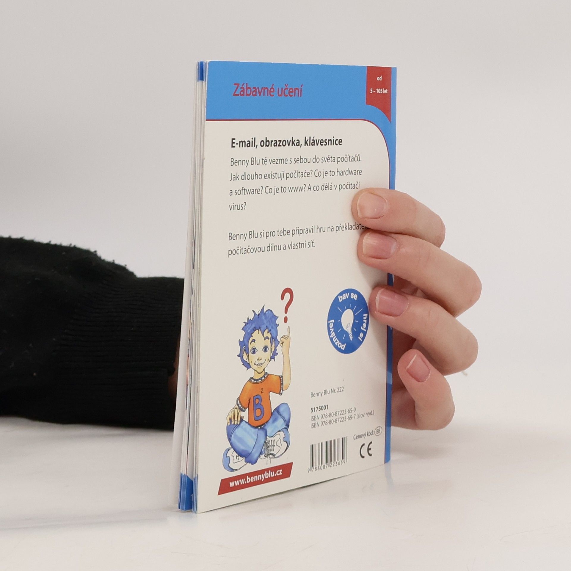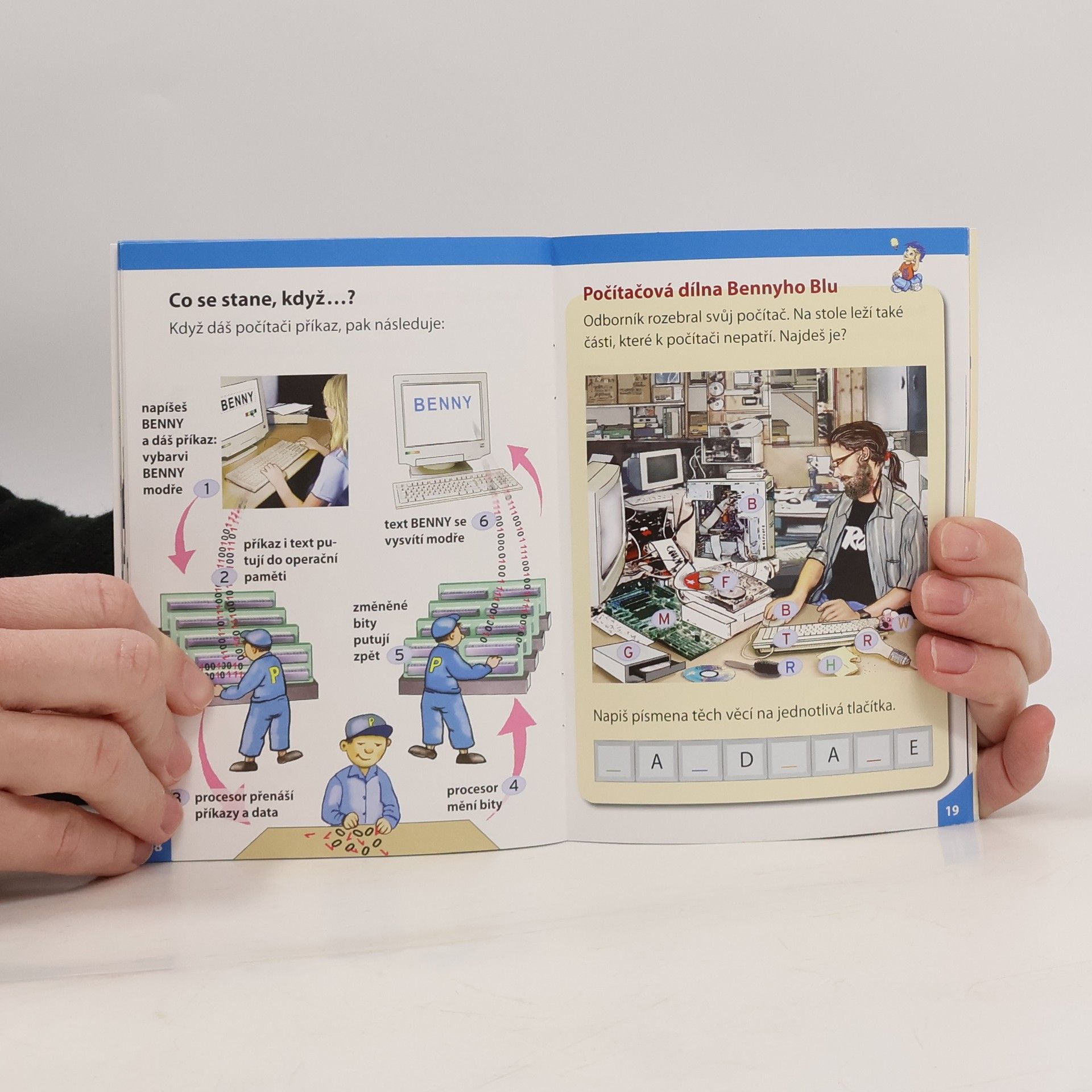 Pro všechny, kteří chtějí vědět, co jsou bity a byty. E-mail, obrazovka, klávesnice. Benny Blu tě vezme s sebou do světa počítačů. Jak dlouho existují počítače? Co dělá v počítači virus? Co je to hardware a software? A co dělá v počítači červ? Něco navíc: Benny Blu si pro tebe připravil hru na překladatele, počítačovou dílnu a vlastní síť.