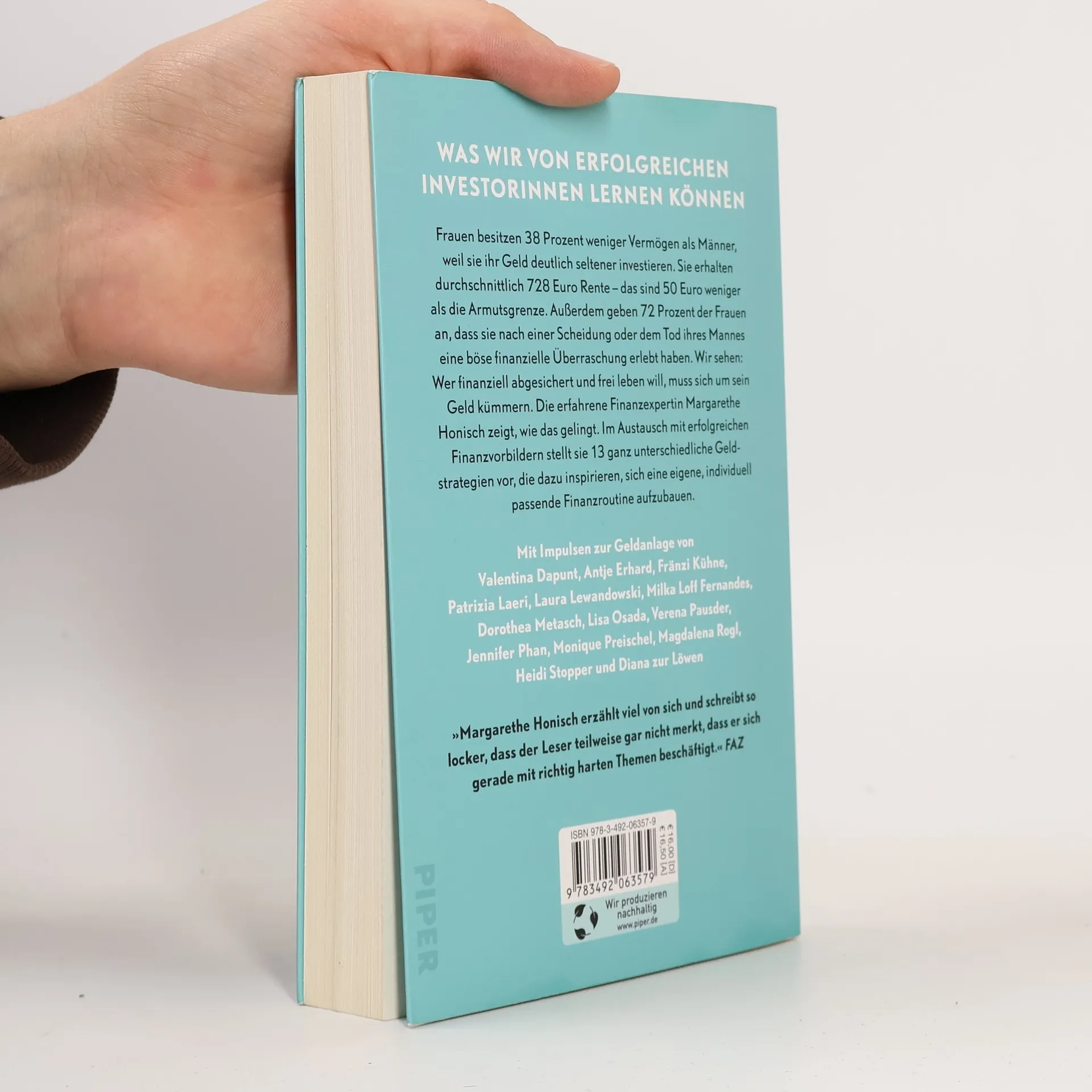 Frauen besitzen 38 Prozent weniger Vermögen als Männer, weil wir unser Geld deutlich seltener investieren. Wir erhalten durchschnittlich 728 Euro Rente – das sind 50 Euro weniger als die Armutsgrenze. Außerdem geben 72 Prozent der Frauen an, dass sie nach einer Scheidung oder dem Tod ihres Mannes eine böse finanzielle Überraschung erlebt haben. Wir sehen: Wer finanziell abgesichert und frei leben will, muss sich um sein Geld kümmern. Die erfahrene Finanzexpertin Margarethe Honisch zeigt, wie das gelingt. Im Austausch mit erfolgreichen Finanzvorbildern stellt sie 13 ganz unterschiedliche Anlagestrategien vor, die dazu inspirieren, sich eine eigene, individuell passende Finanzroutine aufzubauen. Mit Impulsen zur Geldanlage von Valentina Dapunt, Antje Erhard, Fränzi Kühne, Patrizia Laeri, Laura Lewandowski, Dorothea Metasch, Lisa Osada, Verena Pausder, Jennifer Phan, Monique Preischel, Magdalena Rogl, Heidi Stopper und Diana zur Löwen »Margarethe Honisch führt spannend und humorvoll durch die Welt des Geldes - und verrät einem ganz nebenbei den Weg zur finanziellen Freiheit. Nur zu empfehlen!« Thomas Kehl, Gründer von Finanzfluss