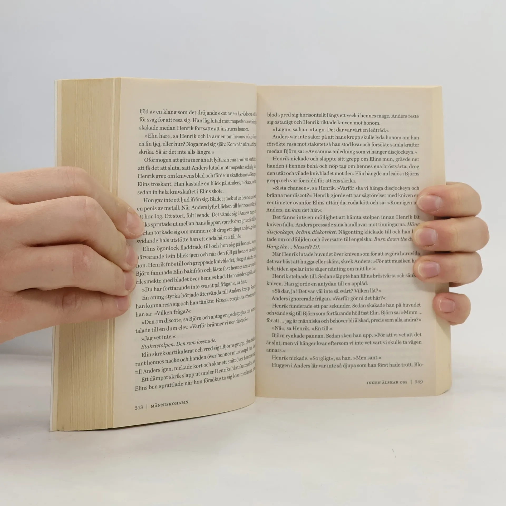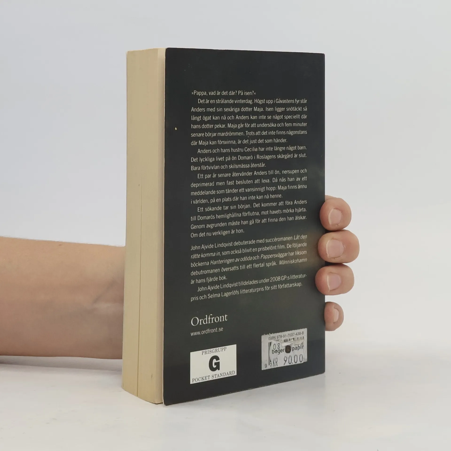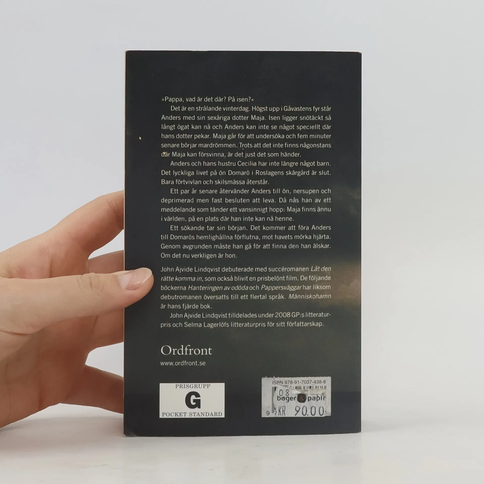”PAPPA, VAD ÄR det där? På isen?” Det är en strålande vinterdag. Högst upp i Gåvastens fyr står Anders med sin sexåriga dotter Maja. Isen ligger snötäckt så långt ögat kan nå och Anders kan inte se något speciellt där hans dotter pekar. Maja går för att undersöka och fem minuter senare börjar mardrömmen. Trots att det inte finns någonstans där Maja kan försvinna, är det just det som händer. Hon försvinner. Spårlöst. Anders och hans hustru Cecilia har inte längre något barn. Det lyckliga livet på ön Domarö i Roslagens skärgård är slut. Bara förtvivlan och skilsmässa återstår. Ett par år senare återvänder Anders till ön, nersupen och deprimerad men fast besluten att leva. Då nås han av ett meddelande som tänder ett vansinnigt hopp: Maja finns ännu i världen, på en plats där han inte kan nå henne. Ett sökande tar sin början. Det kommer att föra Anders till Domarös hemlighållna förflutna, mot havets mörka hjärta. Genom avgrunden måste han gå för att finna den han älskar. Om det nu verkligen är hon. En mopedmotor hörs i skogen om nätterna. Brevlådor vandaliseras och hus brinner. Havet kastar sig mot klipporna. Någon hatar oss. Människohamn av John Ajvide Lindqvist är en saga om kärlek, hat och magi. Det är berättelsen om de dolda krafter som har skapat skärgården.