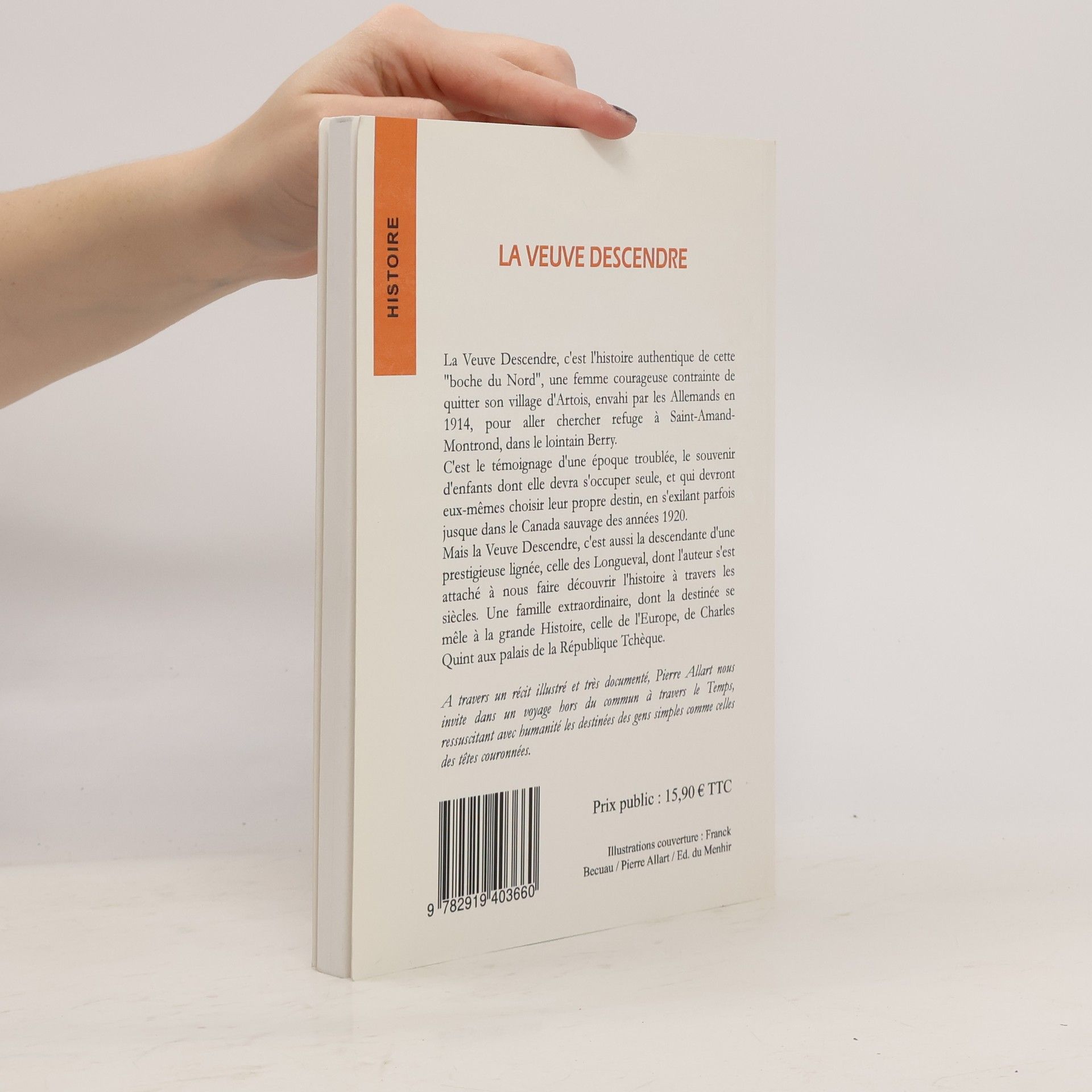 La Veuve Descendre, c'est l'histoire authentique de cette "boche du Nord", une femme courageuse contrainte de quitter son village d'Artois, envahi par les Allemands en 1914, pour aller chercher refuge à Saint-Amand-Montrond, dans le lointain Berry. C'est le témoignage d'une époque troublée, le souvenir d'enfants dont elle devra s'occuper seule, et qui devront eux-mêmes choisir leur propre destin, en s'exilant parfois jusque dans le Canada sauvage des années 1920.Mais la Veuve Descendre, c'est aussi la descendante d'une prestigieuse lignée, celle des Longueval, dont l'auteur s'est attaché à nous faire découvrir l'histoire à travers les siècles. Une famille extraordinaire, dont la destinée se mêle à la grande Histoire, celle de l'Europe, de Charles Quint aux palais de la République Tchèque.A travers un récit illustré et très documenté, Pierre Allart nous invite dans un voyage hors du commun à travers le Temps, ressuscitant avec humanité les destinées des gens simples comme celles des têtes couronnées.