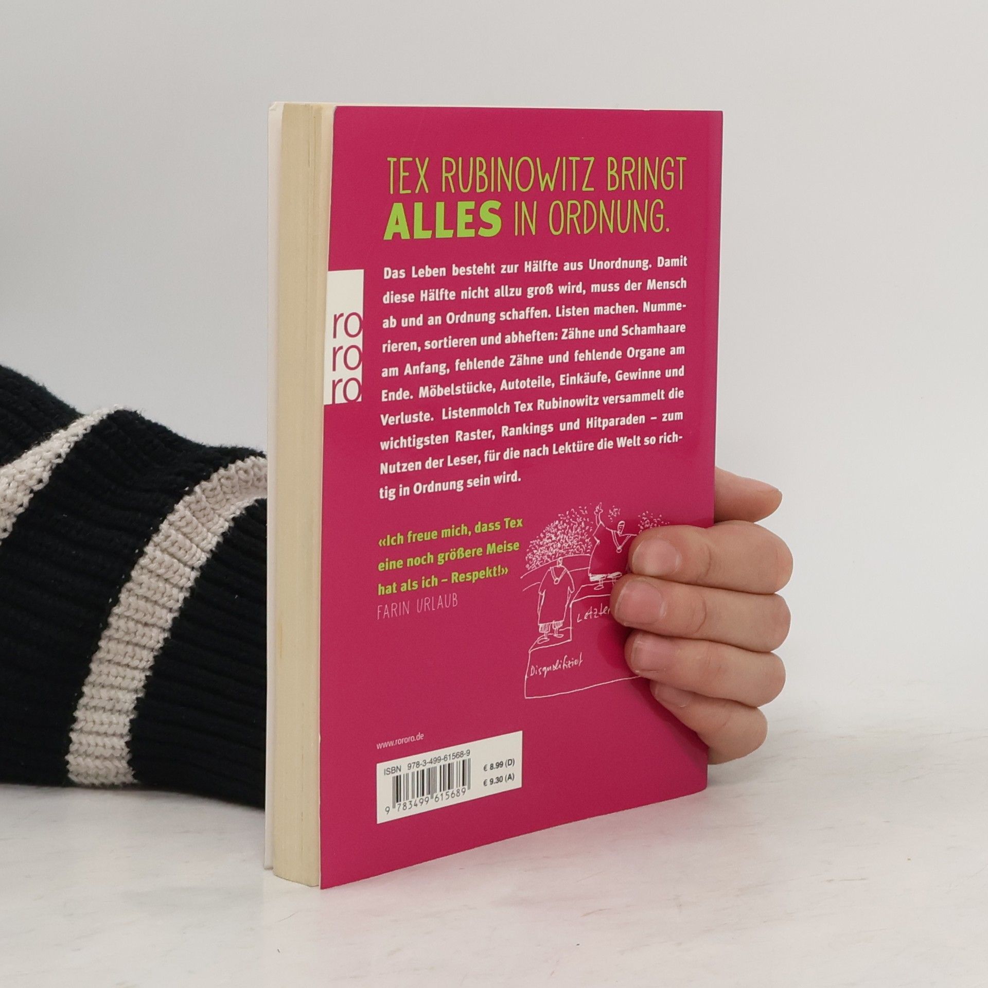 Tex Rubinowitz bringt ALLES in Ordnung Das Leben besteht zur Hälfte aus Unordnung. Damit diese Hälfte nicht allzu groß wird, muss der Mensch ab und an Ordnung schaffen. Listen machen. Nummerieren, sortieren und abheften: Zähne und Schamhaare am Anfang, fehlende Zähne und fehlende Organe am Ende. Möbelstücke, Autoteile, Einkäufe, Gewinne und Verluste. Listenmolch Tex Rubinowitz versammelt die wichtigsten Raster, Rankings und Hitparaden - zum Nutzen der Leser, für die nach Lektüre die Welt so richtig in Ordnung sein wird.