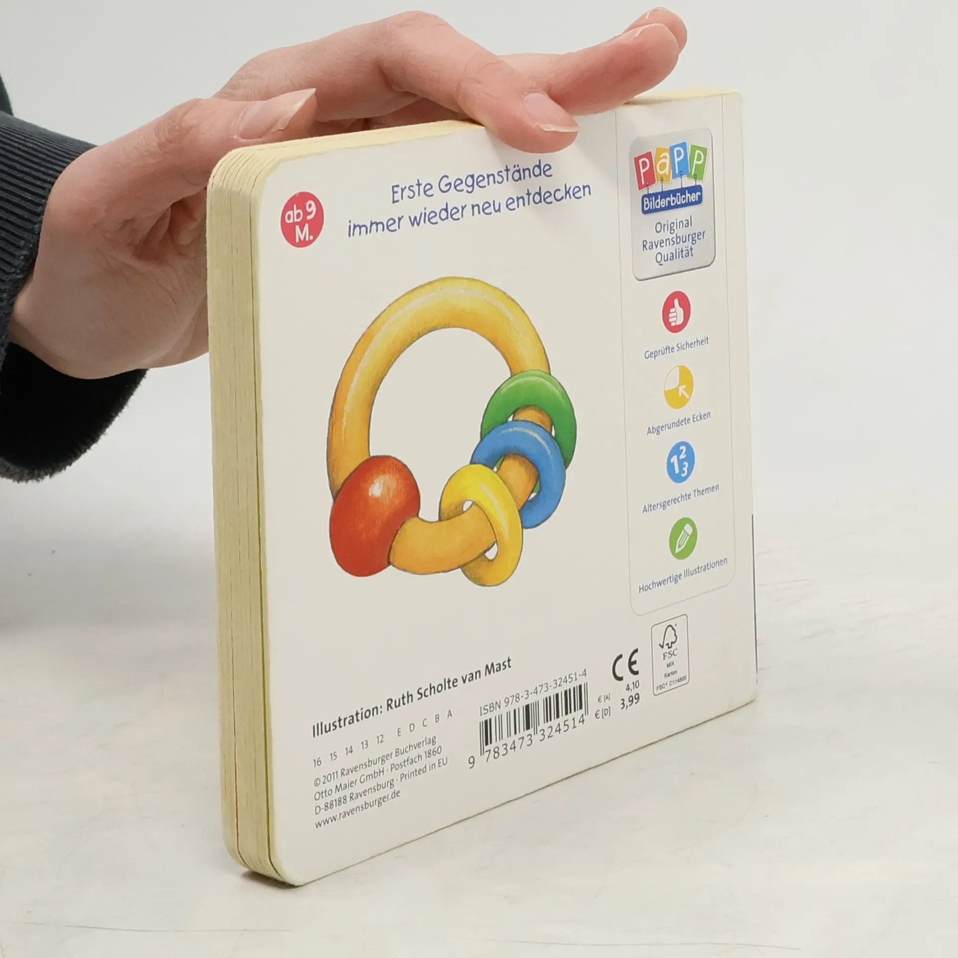 Kinder ab 9 Monaten erkunden mit diesem Buch die allerersten Gegenstände. Der Teddy wird zum Fisch an der Schnullerkette, der kleine Sandmann verwandelt sich zu einer Spieluhr. Durch die Gucklöcher verändern sich die Gegenstände zu ganz neuen Dingen. Die Kleinsten werden so spielerisch zum Vor- und Zurückblättern angeregt. Die Gucklöcher machen nicht nur neugierig auf die nächste Seite, sondern erleichtern auch das Greifen und Blättern. Ganz nebenbei setzt sich ihr Kind spielerisch mit verschiedenen Formen, Größen und Farben auseinander. Nach und nach erkennt es auch die ersten Gegenstände wieder. Das handliche Format ist dabei perfekt geeignet für kleine Kinderhände.