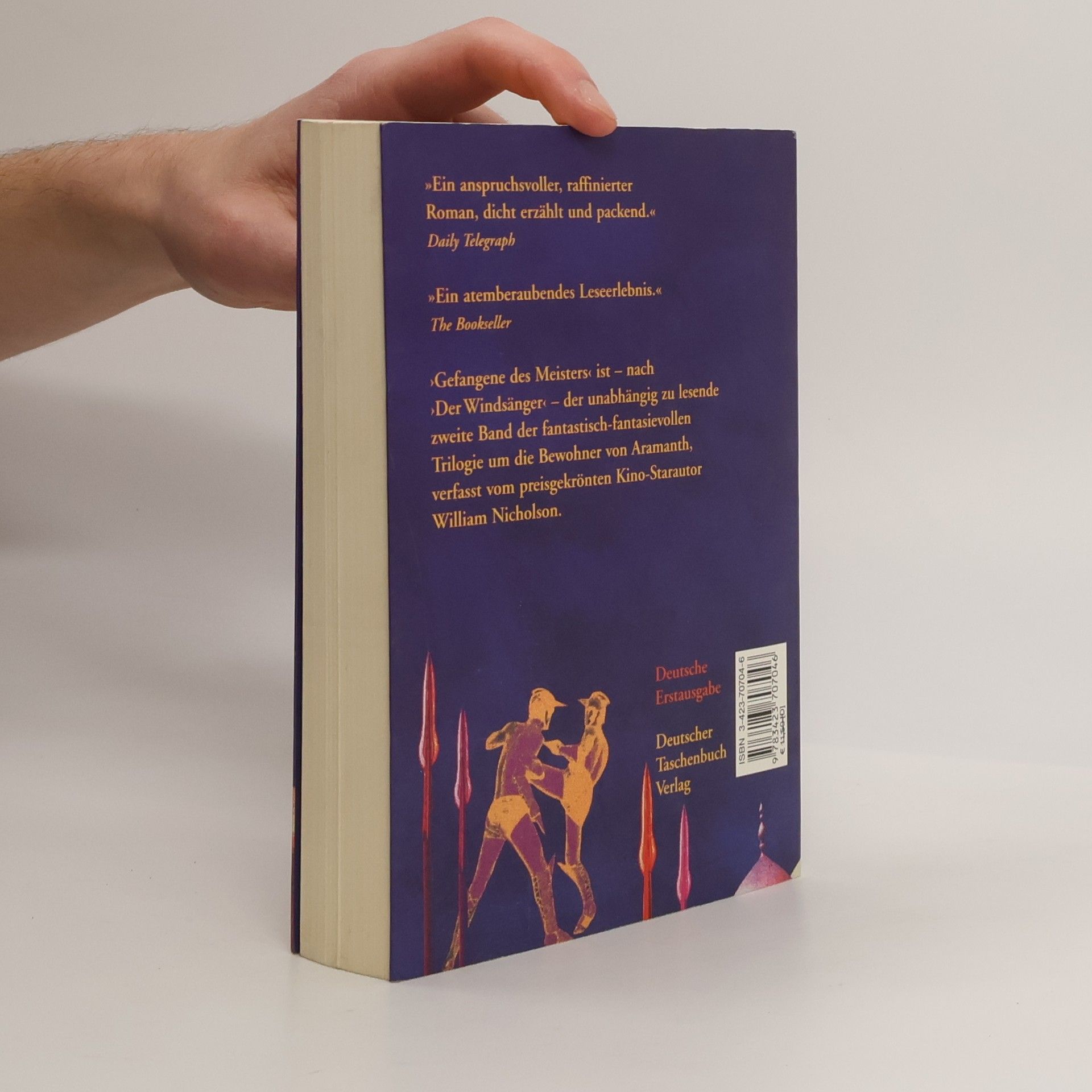 »Volk von Aramanth«, rief Ortiz in die Menge, die vor Entsetzen erstarrt war. Die Einwohner von Aramanth sind von der Armee des Meisterreiches in die Sklaverei verschleppt worden. Wer sich widersetzen will, muss mit grausamen Strafen rechnen. Nur Kestrel konnte entkommen und folgt dem Ruf ihres Zwillingsbruders Bowman, besessen von Rache: Sie will das Reich des Meisters vernichten und Marius Ortiz töten. Unterwegs trifft sie auf einen Zug, der in dieselbe Richtung reist. Johdila, die Tochter des Königs von Gang, ist mit großem Gefolge auf dem Weg zu ihrer Hochzeit mit Ortiz. Kestrel freundet sich schnell mit Johdila an und schmiedet einen komplizierten Plan. Währenddessen sucht auch Bowman nach einem Ausweg. Nach einem Kampfspektakel erkennt er, dass das Reich auf der Willenskraft des Meisters beruht und nur durch einen noch stärkeren Willen besiegt werden kann. Bowman ahnt nicht, dass er selbst diesen übermenschlichen Willen entwickeln muss, um in einem Duell der Geisteskräfte gegen seinen größten Feind zu bestehen. ›Gefangene des Meisters‹ ist der unabhängig lesbare zweite Band der fantastischen Trilogie um die Bewohner von Aramanth, verfasst vom preisgekrönten Kino-Starautor William Nicholson.