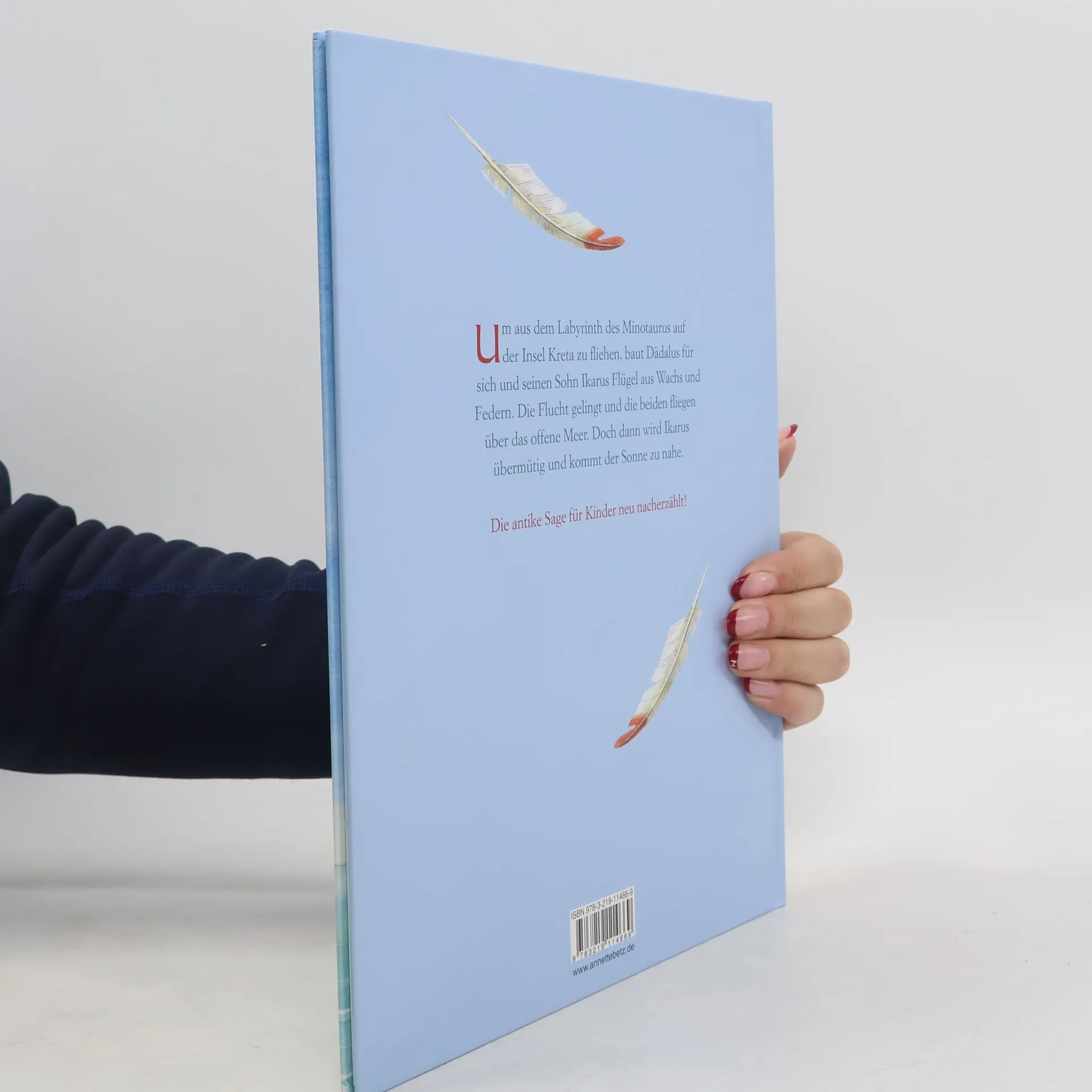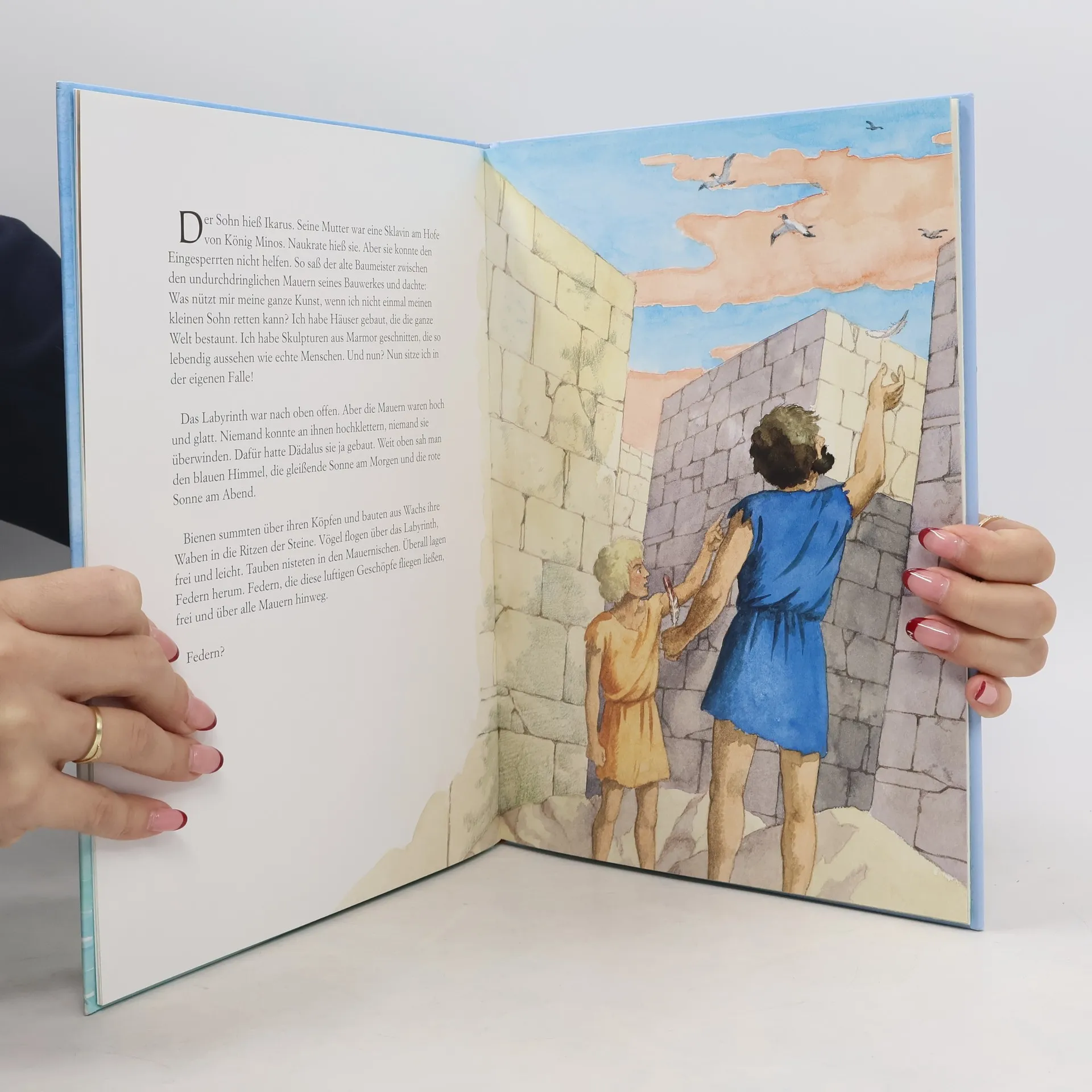 Wer hoch steigt … Um aus dem Labyrinth des Minotaurus zu fliehen, baut Dädalus für sich und seinen Sohn Flügel aus Federn und Wachs. Die Flucht gelingt, doch dann kommt Ikarus der Sonne zu nahe. Der bekannte antike Sagenstoff spannend und kindgerecht nacherzählt von Rudolf Herfurtner.