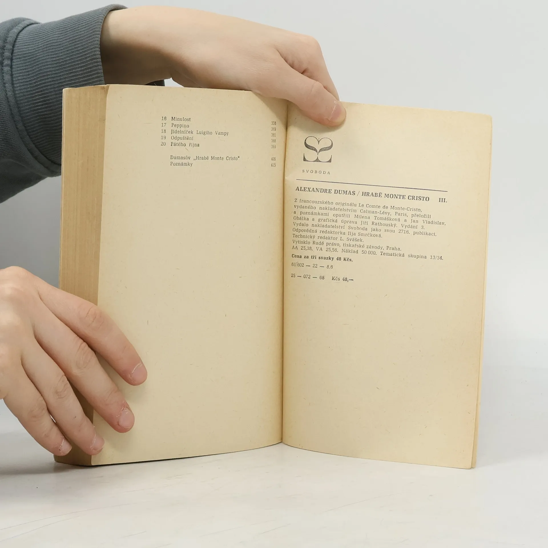 Třetí svazek obsahuje 5. a 6. díl. ,,Na konci knihy Edmond Dantés již sytý pomsty jde tak daleko, že obdaří věnem slečnu de Villefort, dceru svého nepřítele, která si vezme Morrela, syna jeho přítele. Ale když oba mladí novomanželé chtějí poděkovat Monte Cristovi, svému dobrodinci, a ptají se jeho námořníka, kde je hrabě a Haydée, Jacopo ukáže rukou k obzoru: ,Oči mladých lidí se upřely k čáře označené námořníkem a na tom temně modrém rozmezí, jež oddělovalo nebe od Středozemního moře, zpozorovali bílou plachtu velikou jako peruť racka...' "