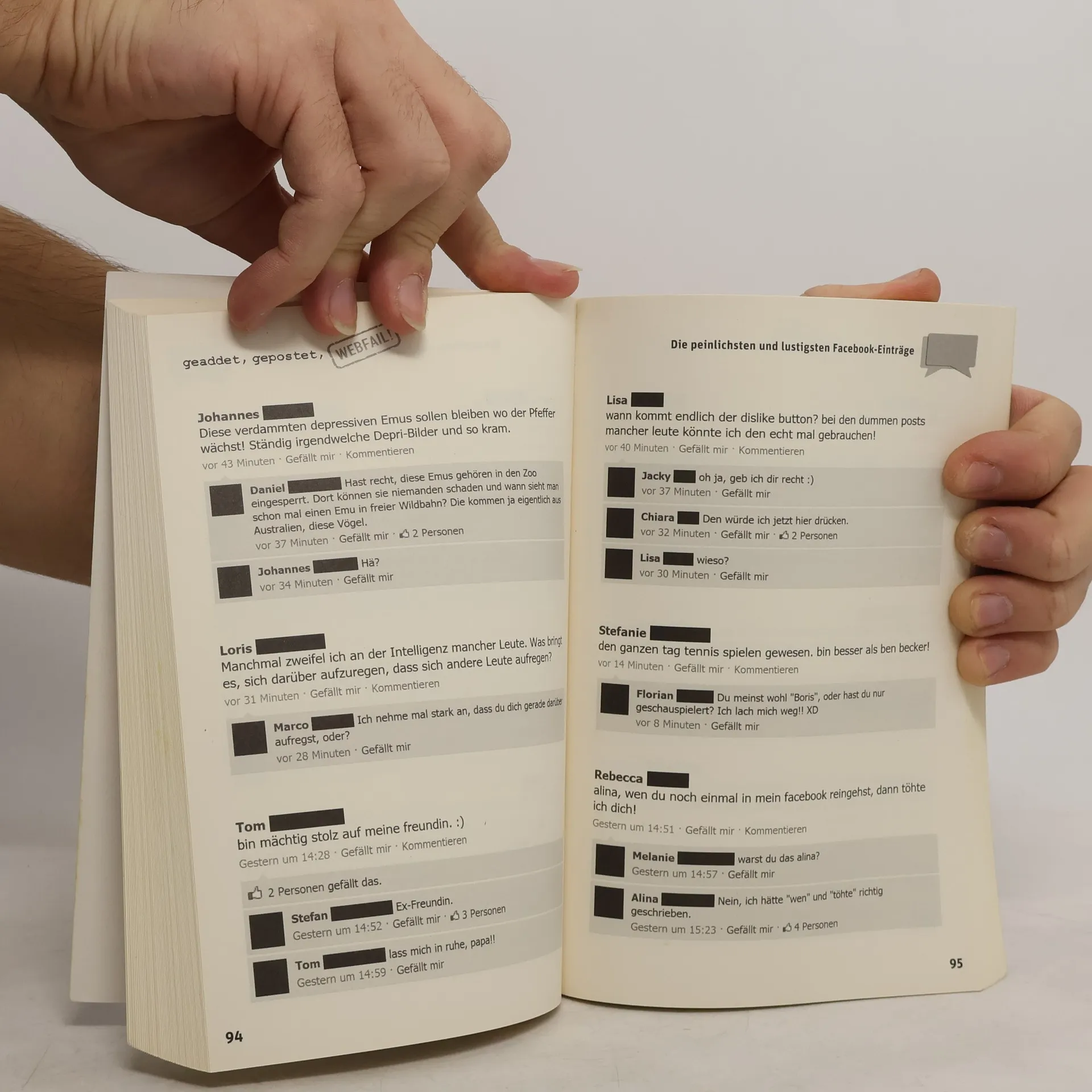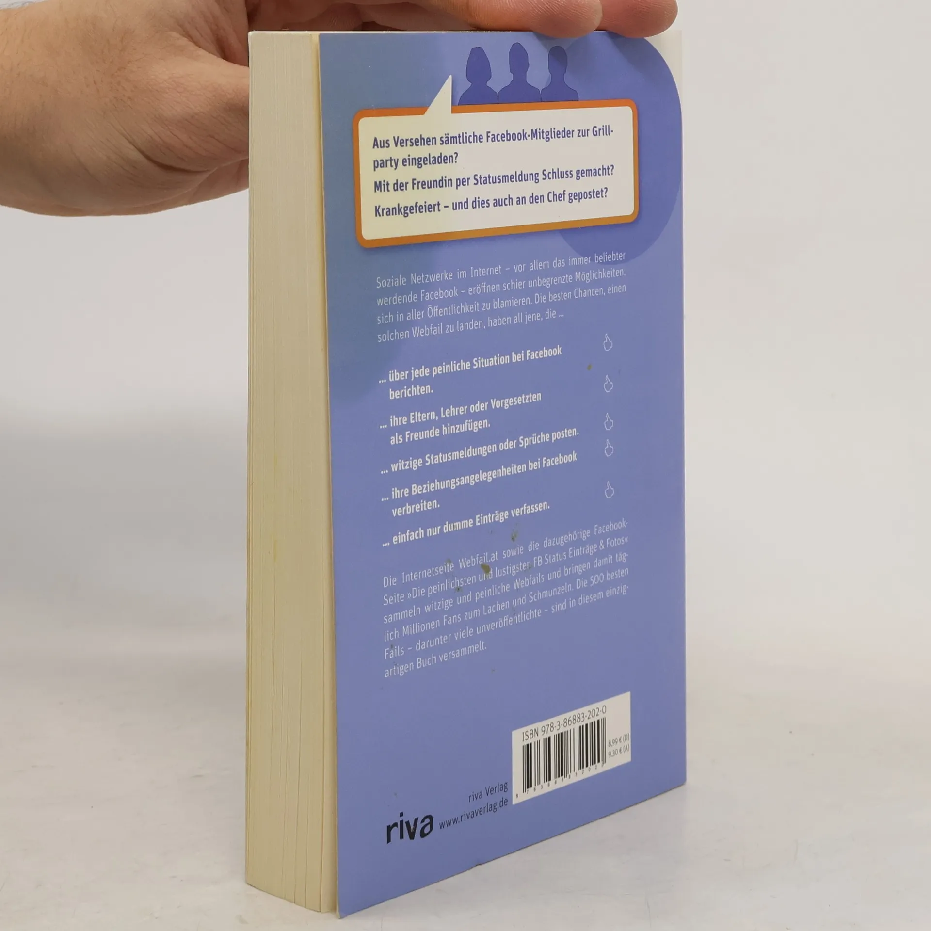Aus Versehen sämtliche Facebook-Mitglieder zur Grillparty eingeladen? Mit der Freundin per Statusmeldung Schluss gemacht? Krankgefeiert – und dies auch an den Chef gepostet? Soziale Netzwerke im Internet – vor allem das immer beliebter werdende Facebook – eröffnen schier unbegrenzte Möglichkeiten, sich in aller Öffentlichkeit zu blamieren. Die besten Chancen, einen solchen Webfail zu landen, haben all jene, die … … über jede peinliche Situation bei Facebook berichten. … ihre Eltern, Lehrer oder Vorgesetzten als Freunde hinzufügen. … witzige Statusmeldungen oder Sprüche posten. … ihre Beziehungsangelegenheiten bei Facebook verbreiten. … einfach nur dumme Einträge verfassen. Die Internetseite Webfail. at sowie die dazugehörige Facebook-Seite »Die peinlichsten und lustigsten FB Status Einträge & Fotos« sammeln witzige und peinliche Webfails und bringen damit täglich Millionen Anhänger zum Lachen und Schmunzeln. Die 500 besten Fails – darunter viele unveröffentlichte – sind in diesem einzigartigen Buch versammelt.