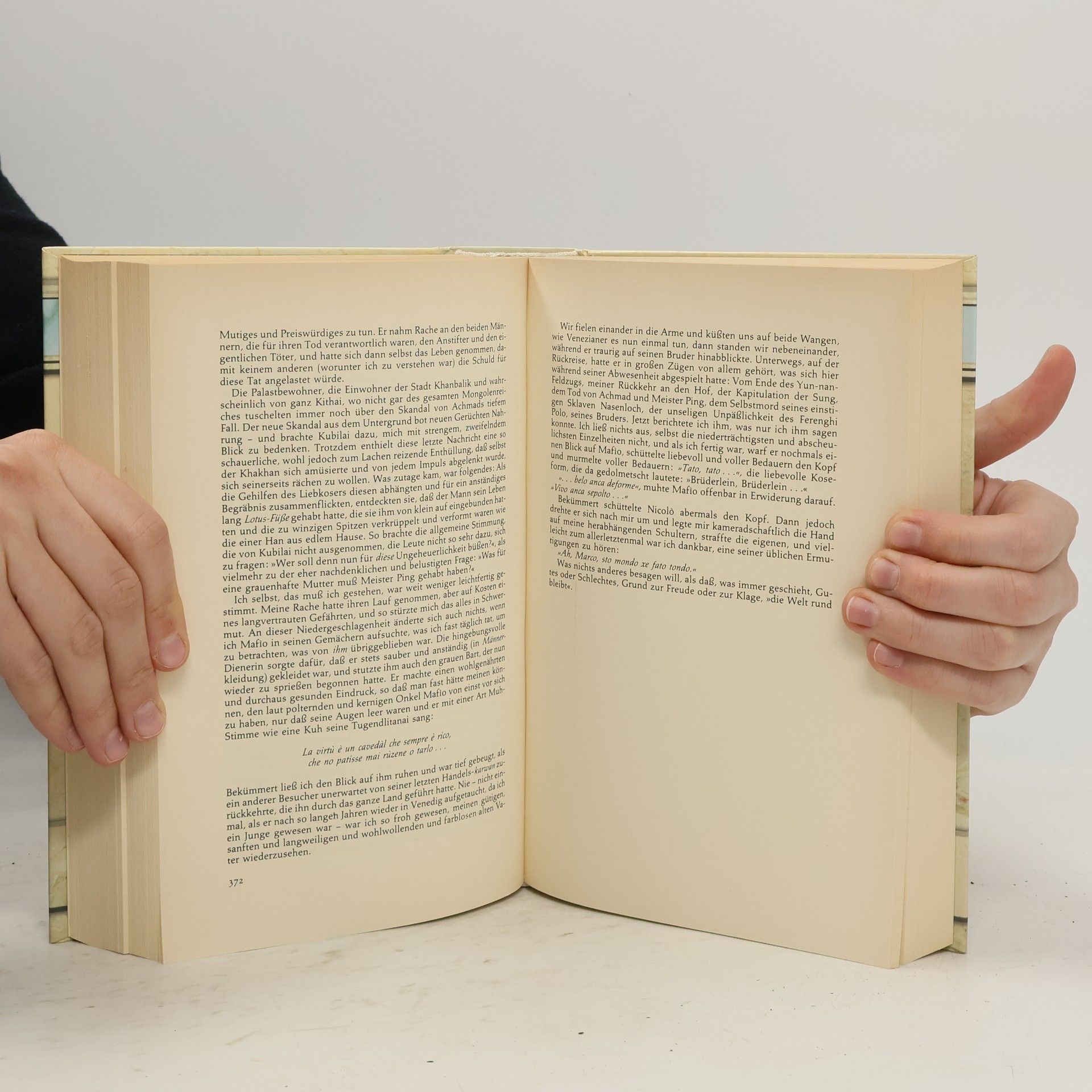 'Als Marco Polo im Sterben lag', berichtete der erste Biograph des Reisenden, Fra Jacopo d'Acqui, 'bedrängten ihn sein Priester, seine Freunde und seine Verwandten, endlich den unzähligen Lügen abzuschwören, die er als seine wahren Abenteuer ausgegeben. Der alte Mann bäumte sich auf, verfluchte sie alle miteinander und erklärte: > Ich habe nicht die Hälfte von dem berichtet, was ich gesehen und getan habe.' Der Autor verfolgt den Weg des Marco Polo von den Palästen, Gassen und Kanälen im mittelalterlichen Venedig bis zum prächtigen Hof des Kubilai Khan in Khanbalik, dem alten Peking, schildert dessen Erlebnisse im Dunstkreis der parfümierten Sexualität der Levante bis zu den Gefahren einer Reise auf der Seidenstraße, beschreibt die Menschen, denen Marco Polo begegnet ist. In den zwei Jahrzehnten seiner Reise war Marco Polo Händler, Krieger, Liebhaber, Spion und Steuereinnehmer - aber immer war er ein Reisender, unermüdlich in seinem Hunger nach neuen Erfahrungen.