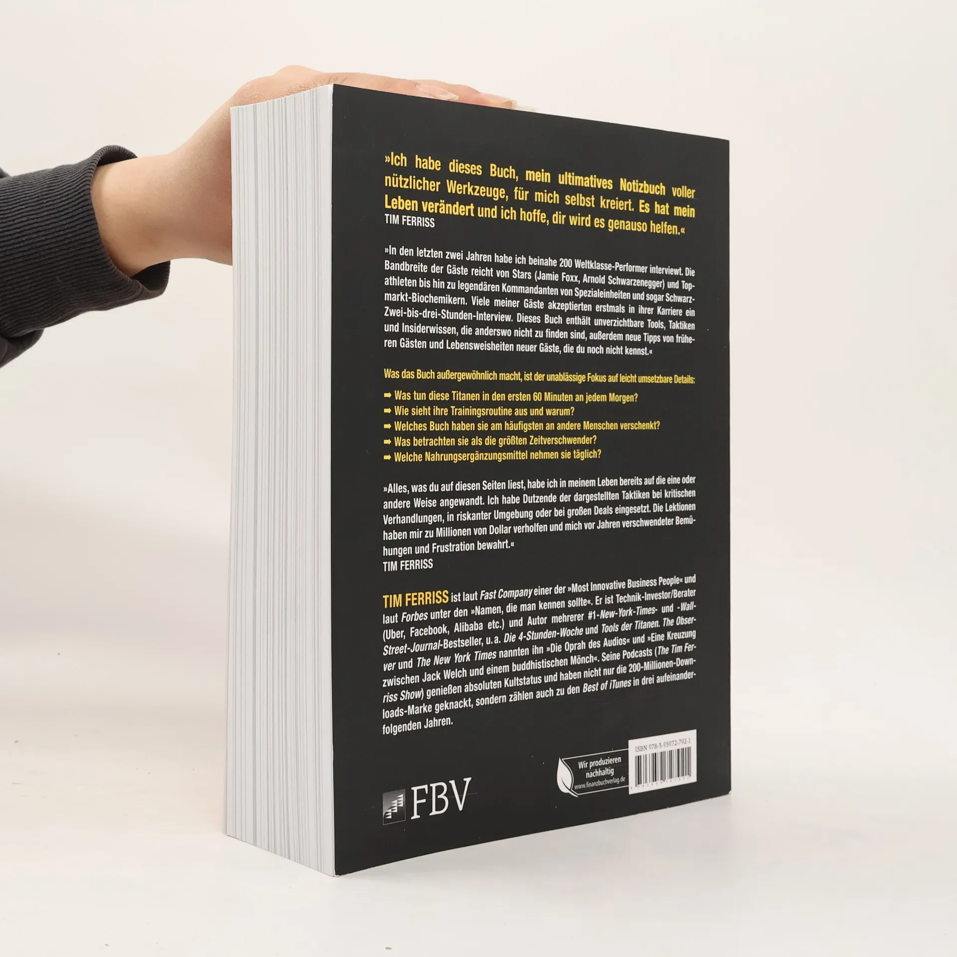 Der Bestsellerautor Tim Ferriss hat 200 Weltklasse-Performer interviewt. Die Bandbreite der Gäste reicht von Stars (Jamie Foxx, Arnold Schwarzenegger) und Topathleten bis hin zu legendären Kommandanten von Spezialeinheiten und sogar Schwarzmarkt-Biochemikern. Viele der Interviewgäste akzeptierten erstmals in ihrer Karriere ein Zwei-bis-drei-Stunden-Interview. Dieses Buch enthält unverzichtbare Tools, Taktiken und Insiderwissen, die anderswo nicht zu finden sind. Was »Tools der Titanen« so außergewöhnlich macht, ist der unablässige Fokus auf leicht umsetzbare Details: Was tun diese Titanen in den ersten 60 Minuten an jedem Morgen? Wie sieht ihre Trainingsroutine aus und warum? Welches Buch haben sie am häufigsten an andere Menschen verschenkt? Was betrachten sie als die größten Zeitverschwender? Tim Ferriss hat Dutzende der dargestellten Taktiken selbst in kritischen Verhandlungen, in riskanten Umgebungen oder bei großen Deals eingesetzt. Die Lektionen haben ihm zu Millionen von Dollars verholfen und ihn vor Jahren verschwendeter Bemühungen und Frustration bewahrt.