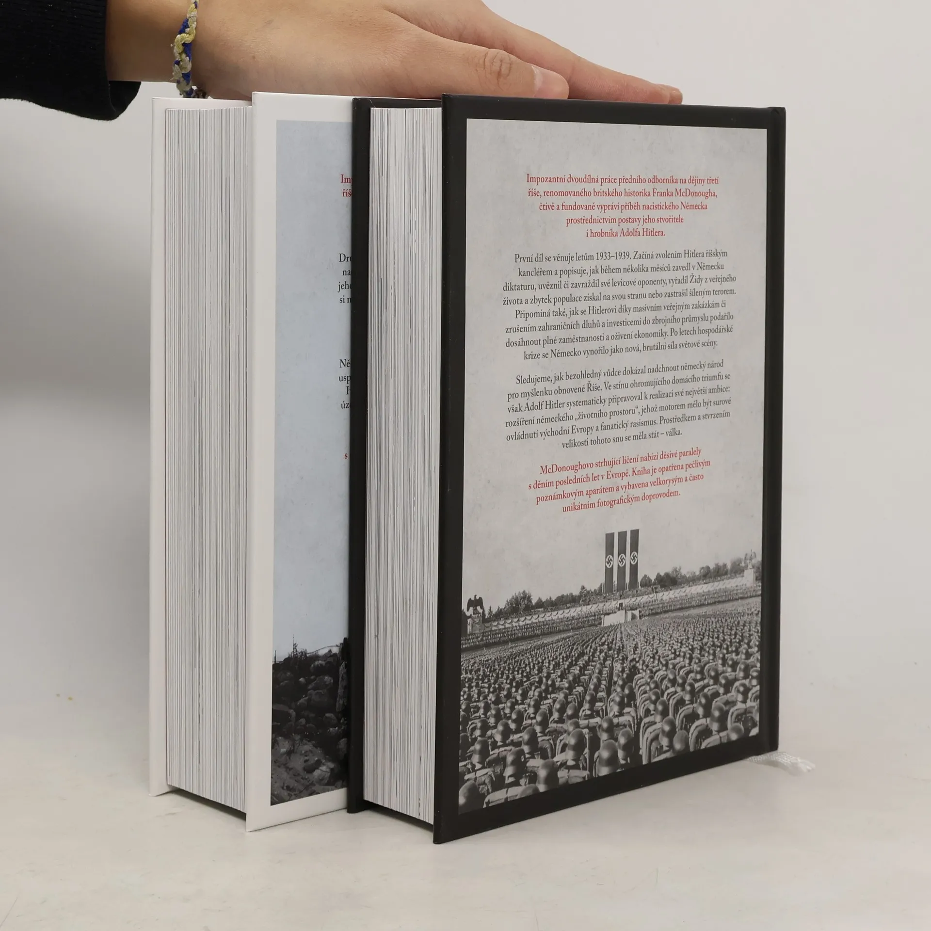Impozantní dvoudílná práce renomovaného britského historika Franka McDonougha čtivě vypráví příběh nacistického Německa prostřednictvím Adolfa Hitlera. McDonoughovo líčení nabízí děsivé paralely s nedávnými událostmi v Evropě a je doplněno pečlivým poznámkovým aparátem a unikátním fotografickým materiálem. První díl se zaměřuje na léta 1933–1939, kdy byl Hitler zvolen říšským kancléřem. Popisuje, jak během několika měsíců zavedl v Německu diktaturu, vyřadil Židy z veřejného života a zastrašil populaci terorem. Díky masivním veřejným zakázkám a investicím do zbrojního průmyslu dosáhl plné zaměstnanosti a oživení ekonomiky, čímž se Německo stalo brutální silou na světové scéně. Hitler systematicky připravoval expanze na východ a jeho ambice vyvrcholily ve válce. Druhý díl pokrývá léta 1940–1945, kdy nacistické Německo stálo na vrcholu moci, ale na konci bylo v troskách a neslo si hanbu holokaustu a válečných zločinů. McDonough ukazuje, že i přes Hitlerovy plány a počáteční úspěchy se Německo nikdy nestalo skutečnou supervelmocí a nemělo šanci uspět proti Spojencům. Díl sleduje Hitlerova vojenská vítězství, nelidské vraždění a konečný obrat na bitevním poli vedoucí k porážce nacionálního socialismu.