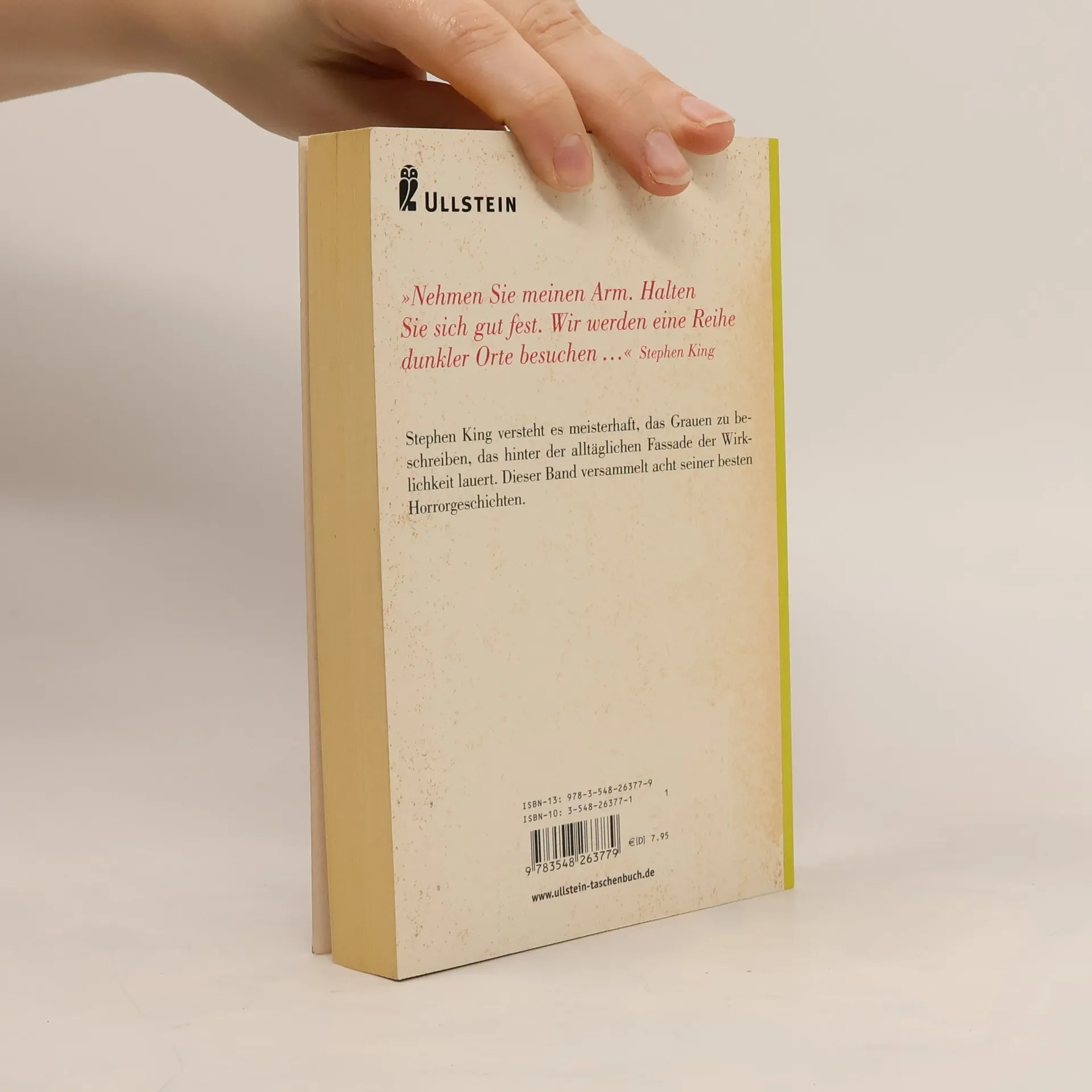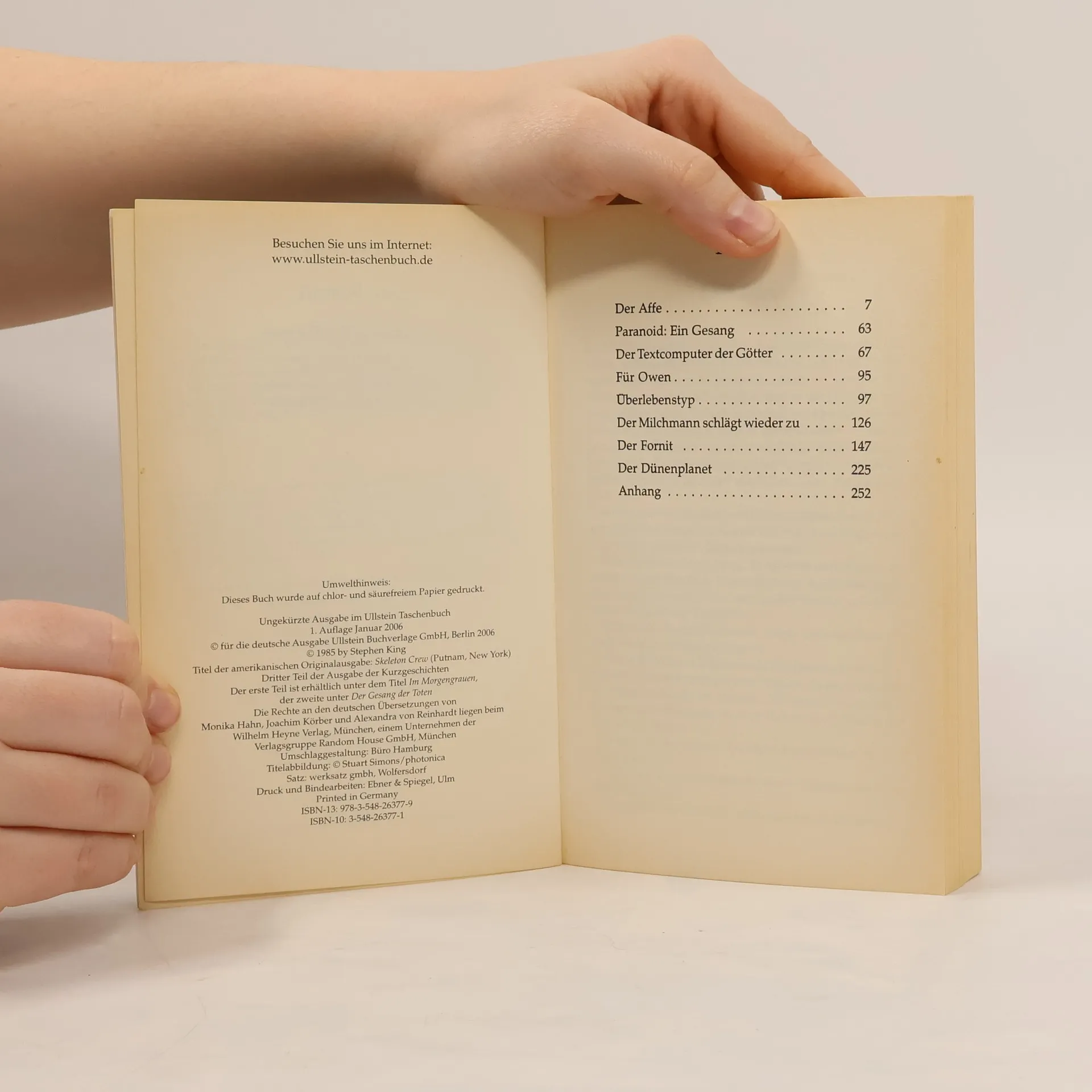 Acht unterschiedliche Werke aus der Feder des "King of Horror", die eines gemeinsam haben: Gänsehaut-Garantie. Ein Junge findet auf dem Dachoden einen scheinbar harmlosen Spielzeugaffen, der den Tod bringt. Ein Paranoider lässt den Leser durch seine Augen blicken. Und ein Schiffbrüchiger wird auf einer felsigen Insel angespült - ohne Nahrung, doch mit seinem Chirurgenbesteck und zwei Kilo Heroin ... (Klappentext).