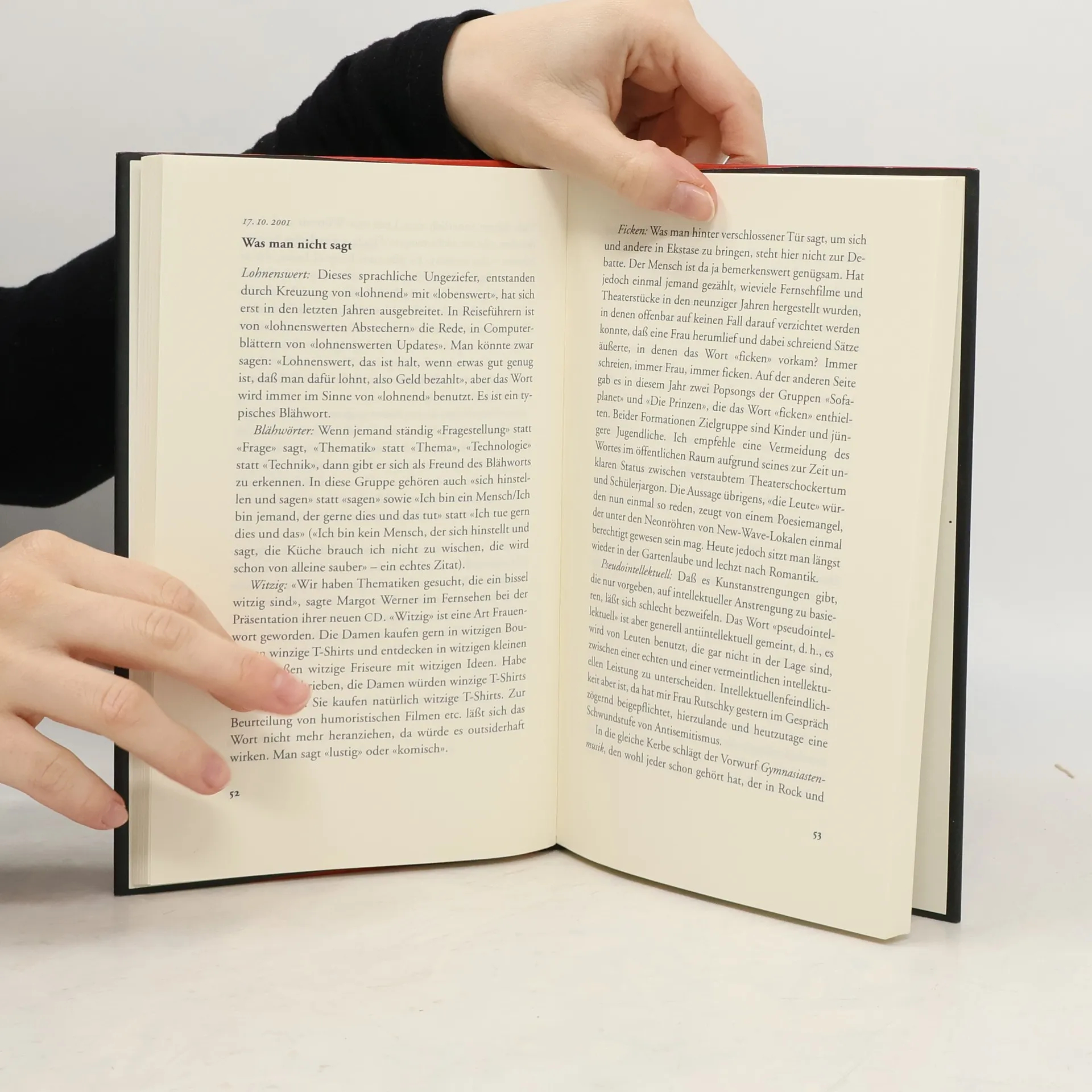 Texte aus den Jahren 2001 und 2002, die durch ihre tagebuchartige Anordnung den Eindruck erwecken, man habe es mit einer Art Tagebuch zu tun. Mit den klugen Worten zu dem, was dem 11. September folgte, und den Erfolgstexten: Es soll keiner dabei sein, den man nicht kennt Kiesinger weiß kein Mensch was drüber und: Was man nicht sagt ebenfalls dabei: Die Passage mit den jungen Frauen, die Ende März aus einem Glas trinken und dabei zu Tausenden fotografiert werden, was jungen Männern nie passiert und die regional bedeutsame Miniatur: Kölner und Düsseldorfer.