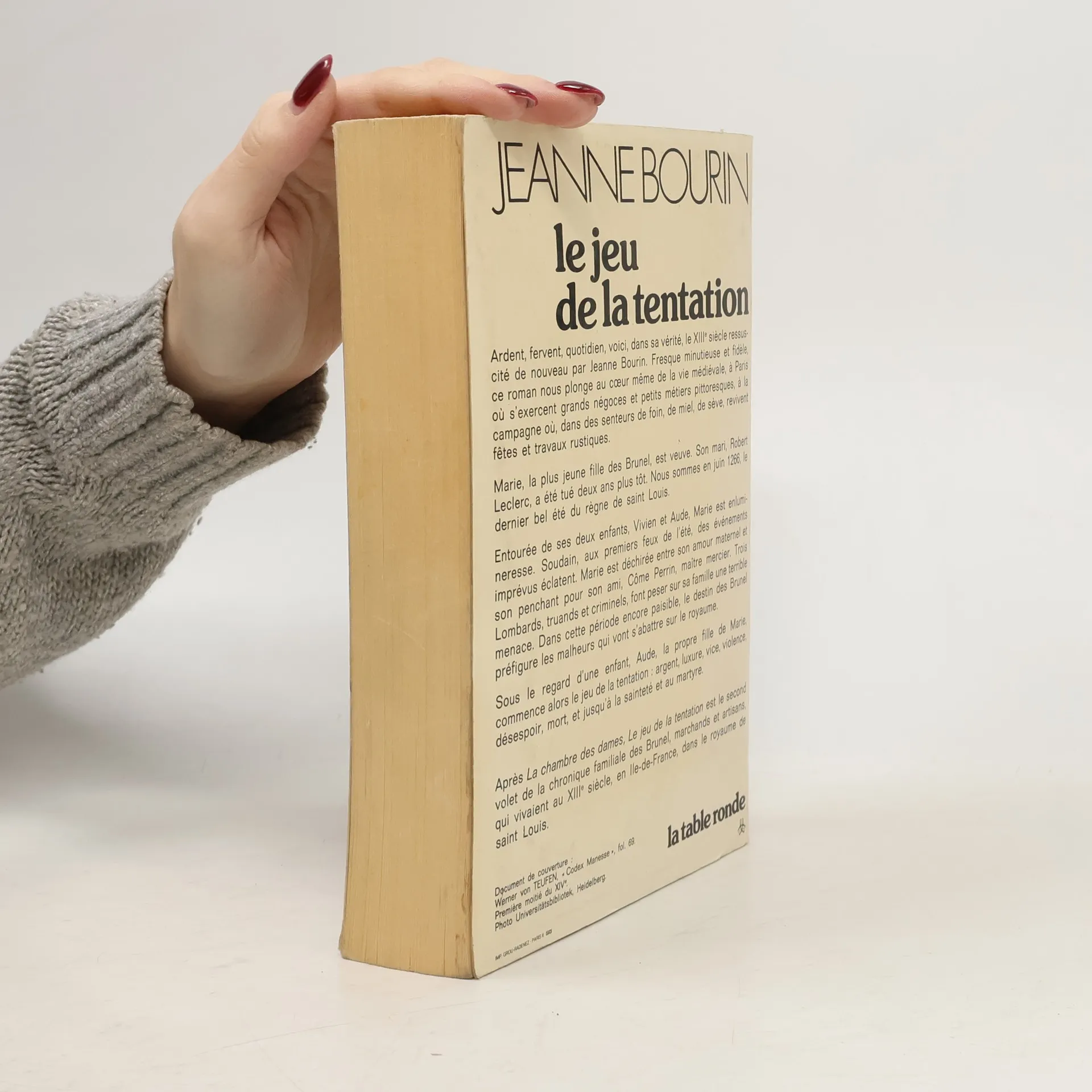 Après La chambre des dames, Le jeu de la tentation est le second volet de la chronique familiale des Brunel. Nous sommes en juin 1266, le dernier bel été du règne de Saint Louis. Marie, la plus jeune fille des Brunel, est veuve depuis deux ans et mère attentionnée de deux enfants, Vivien et Aude. Elle a vingt-sept ans, un métier qu’elle adore, enlumineresse, et un amant fougueux, Côme Perrin, maître mercier. Mais trois truands lombards font peser sur sa famille une terrible menace. Commence alors le jeu de la tentation : argent, luxure, violence, désespoir, mort, jusqu’à la sainteté et au martyre.