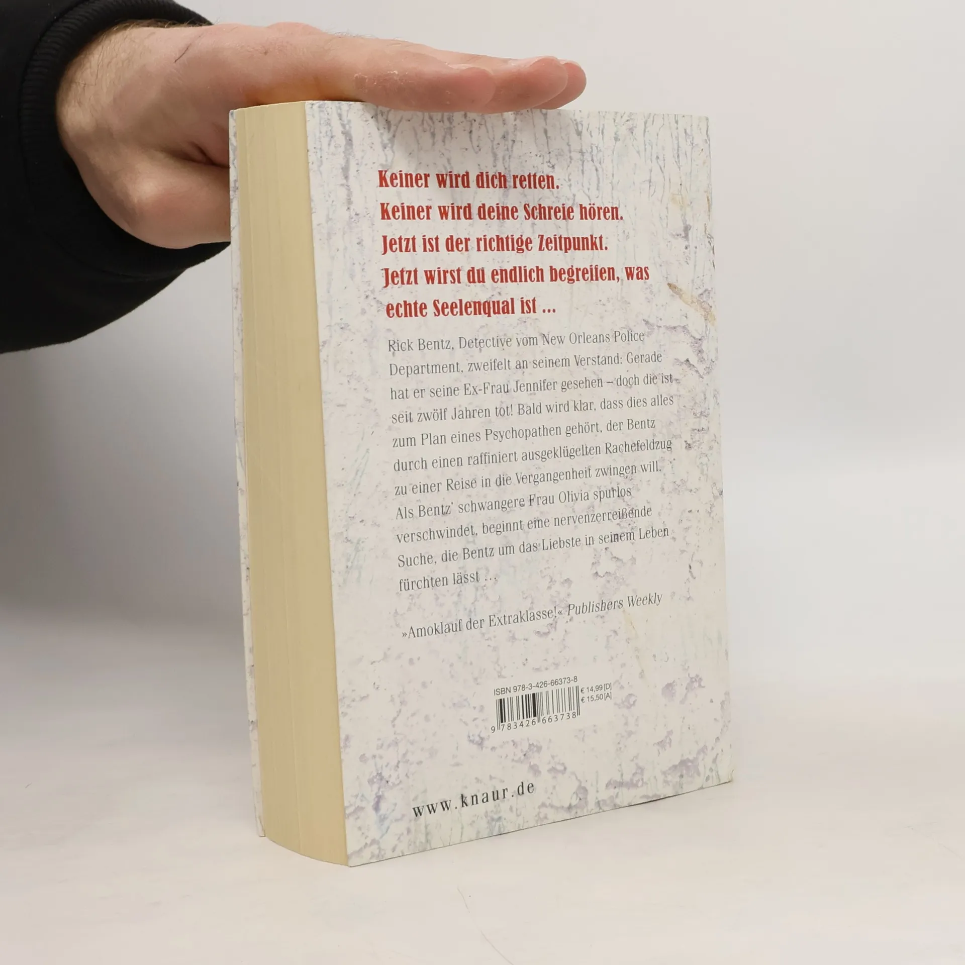 Keiner wird dich retten. Keiner wird deine Schreie hören. Jetzt ist der richtige Zeitpunkt. Jetzt wirst du endlich begreifen, was echte Seelenqual ist ... Rick Bentz, Detective vom New Orleans Police Department, zweifelt an seinem Verstand: Gerade hat er seine Ex-Frau Jennifer gesehen – doch die ist seit zwölf Jahren tot! Bald wird klar, dass dies alles zum Plan eines Psychopathen gehört, der Bentz durch einen raffiniert ausgeklügelten Rachefeldzug zu einer Reise in die Vergangenheit zwingen will. Als Bentz’ schwangere Frau Olivia spurlos verschwindet, beginnt eine nervenzerreißende Suche, die Bentz um das Liebste in seinem Leben fürchten lässt … »Amoklauf der Extraklasse!« Publishers Weekly