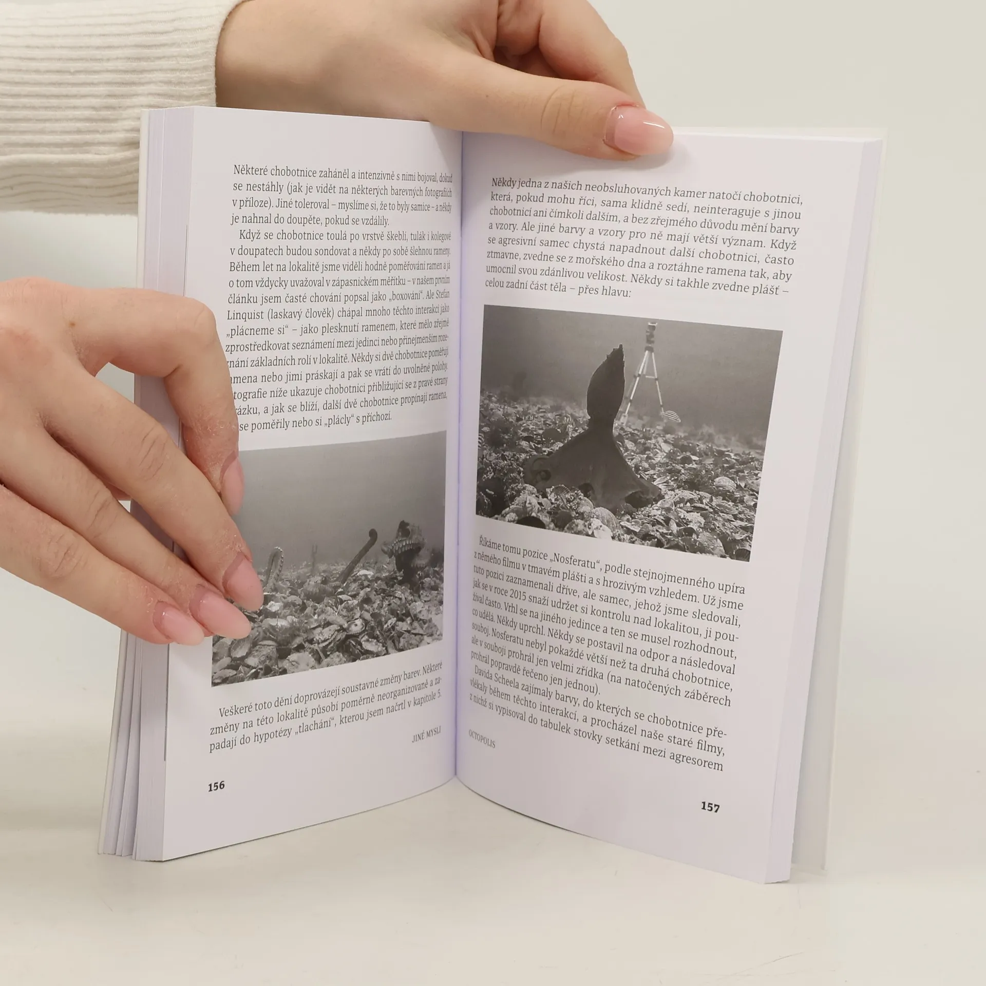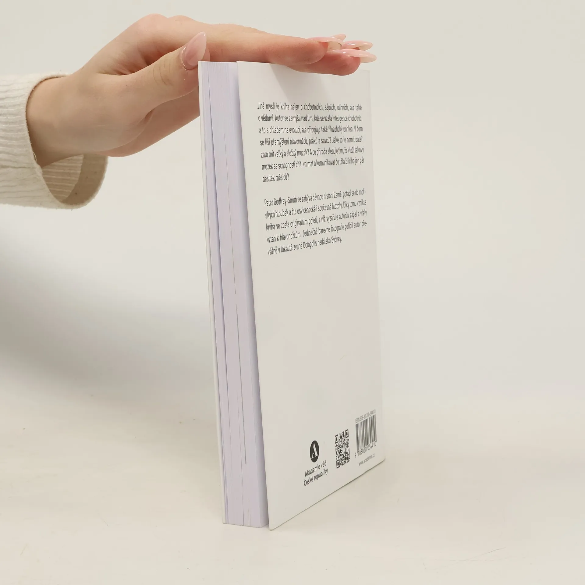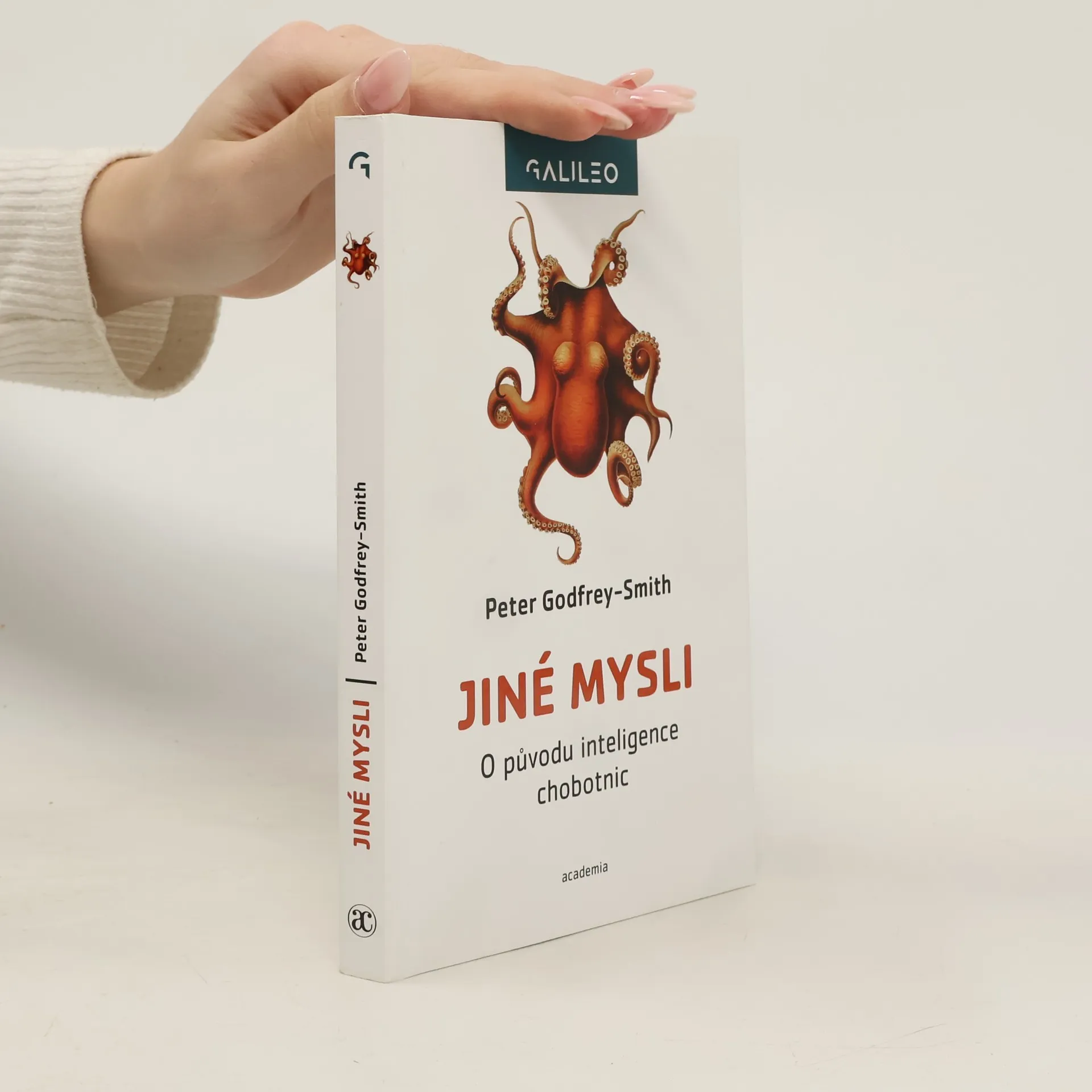 Jiné mysli je kniha nejen o chobotnicích, sépiích, olihních, ale také o vědomí. Autor se zamýšlí nad tím, kde se vzala inteligence chobotnic, a to s ohledem na evoluci, ale připojuje také filozofický pohled. V čem se liší přemýšlení hlavonožců, ptáků a savců? Jaké to je nemít páteř, zato mít velký a složitý mozek? A co příroda sleduje tím, že vloží takový mozek se schopností cítit, vnímat a komunikovat do těla žijícího jen pár desítek měsíců? Peter Godfrey-Smith se zabývá dávnou historií Země, potápí se do mořských hloubek a čte osvícenecké i současné filozofy. Díky tomu vznikla kniha ve zcela originálním pojetí, z níž vyzařuje autorův zápal a vřelý vztah k hlavonožcům. Jedinečné barevné fotografie pořídil autor převážně v lokalitě zvané Octopolis nedaleko Sydney.