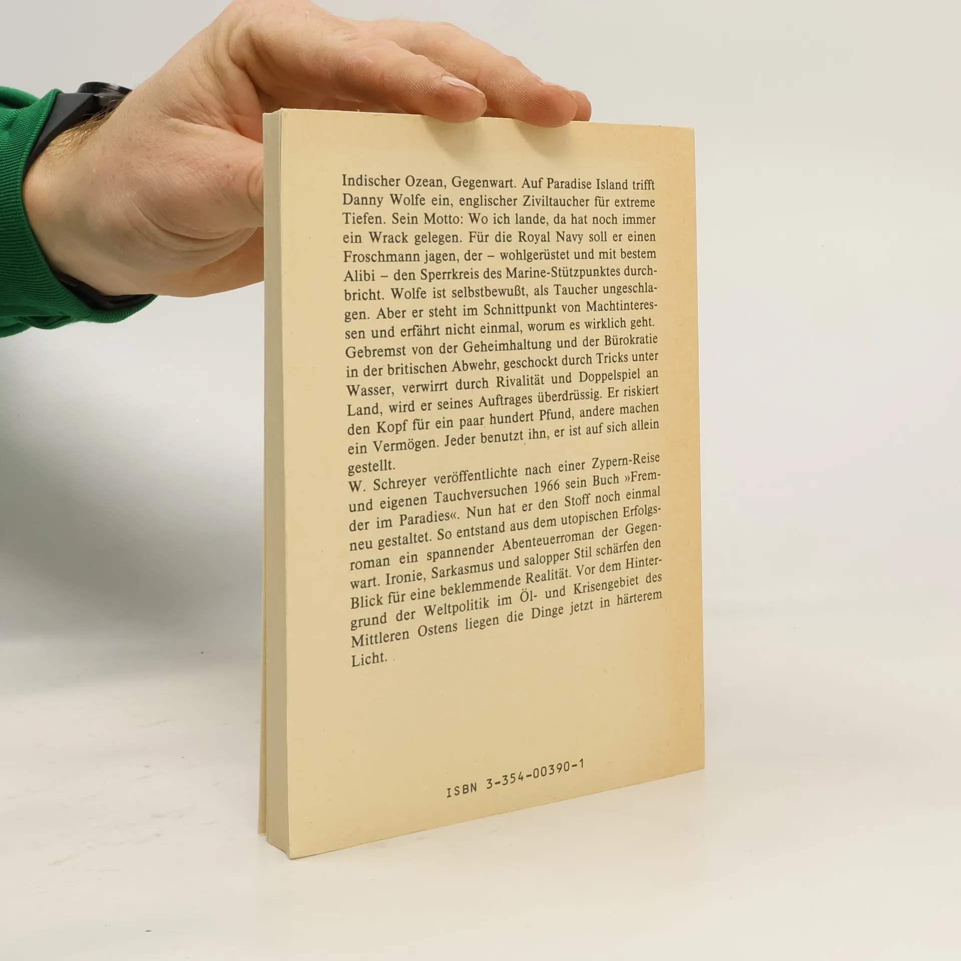 Indischer Ozean, Gegenwart. Auf Paradise Island trifft Danny Wolfe ein, englischer Ziviltaucher für extreme Tiefen. Sein Wo ich lande, da hat noch immer ein Wrack gelegen. Für die Royal Navy soll er einen Froschmann jagen, der — wohlgerüstet und mit bestem Alibi — den Sperrkreis des Marine-Stützpunktes durchbricht. Wolfe ist selbstbewusst, als Taucher ungeschlagen. Aber er steht im Schnittpunkt von Machtinteressen und erfährt nicht einmal, worum es wirklich geht.Gebremst von der Geheimhaltung und der Bürokratie in der britischen Abwehr, geschockt durch Tricks unter Wasser, verwirrt durch Rivalität und Doppelspiel an Land, wird er seines Auftrages überdrüssig. Er riskiert den Kopf für ein paar hundert Pfund, andere machen ein Vermögen. Jeder benutzt ihn, er ist auf sich allein gestellt.Wolfgang Schreyer veröffentlichte nach einer Zypern-Reise und eigenen Tauchversuchen 1966 sein Buch „Fremder im Paradies". 1982 hat er den Stoff noch einmal neu gestaltet. So entstand aus dem utopischen Erfolgsroman ein spannender Abenteuerroman. Ironie, Sarkasmus und salopper Stil schärfen den Blick für eine beklemmende Realität. Vor dem Hintergrund der Weltpolitik im Öl- und Krisengebiet des Mittleren Ostens liegen die Dinge jetzt in härterem Licht.
