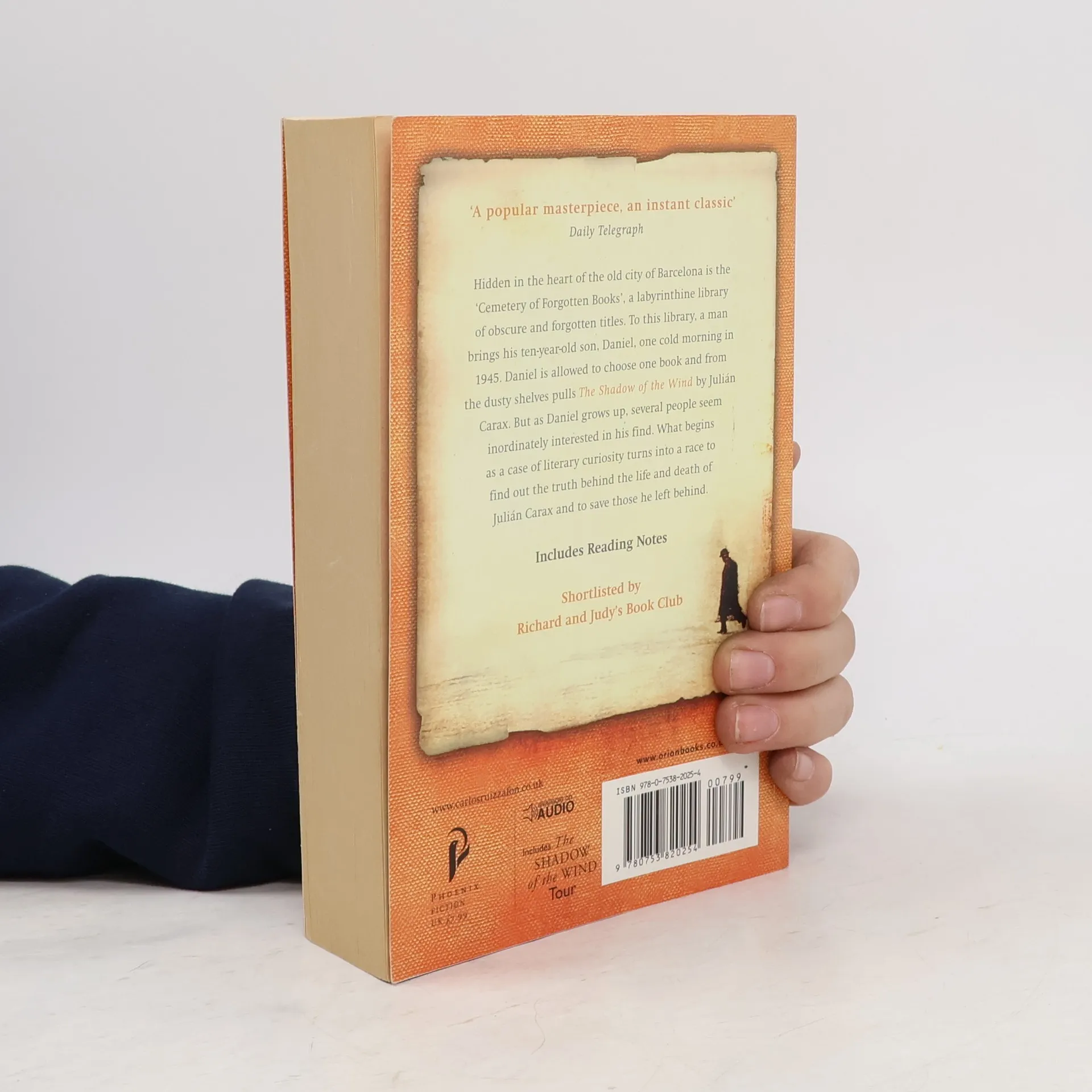Hidden in the heart of the old city of Barcelona is the 'cemetery of lost books', a labyrinthine library of obscure and forgotten titles that have long gone out of print. To this library, a man brings his 10-year-old son Daniel one cold morning in 1945. Daniel is allowed to choose one book from the shelves and pulls out 'La Sombra del Viento' by Julian Carax. But as he grows up, several people seem inordinately interested in his find. Then, one night, as he is wandering the old streets once more, Daniel is approached by a figure who reminds him of a character from La Sombra del Viento, a character who turns out to be the devil. This man is tracking down every last copy of Carax's work in order to burn them. What begins as a case of literary curiosity turns into a race to find out the truth behind the life and death of Julian Carax and to save those he left behind. A page-turning exploration of obsession in literature and love, and the places that obsession can lead.