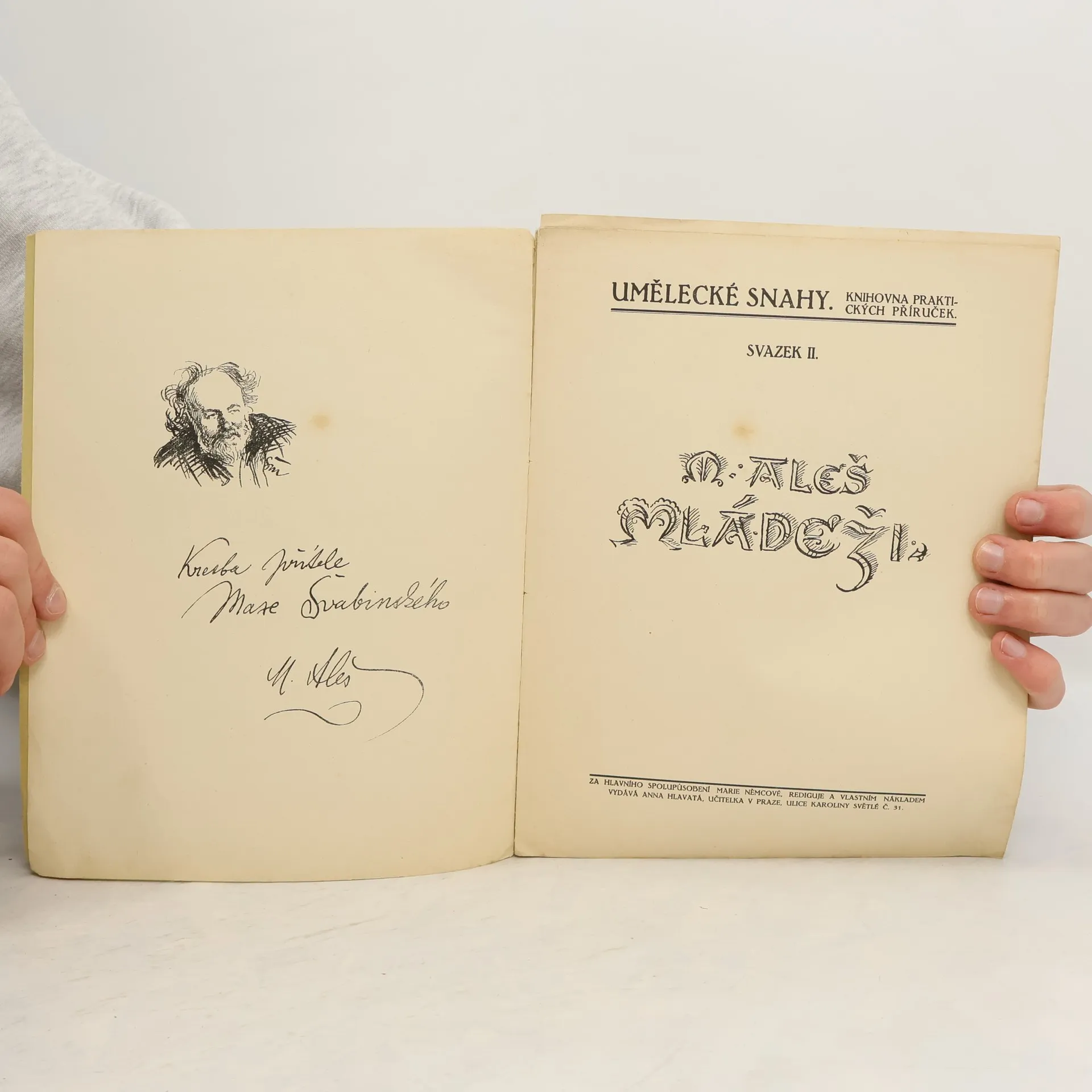 Kniha plná kreseb Mikoláše Alše, jenž na první stranu napsal: "Milované dítky! Já vás nastokrát pozdravuji a za přání Vaše k mým šedesátým narozeninám upřímně děkuji a přeji si vroucně, abyste Vy, naděje naše, naděje národa dospěly prací a láskou k vlasti ku oněm svatým cílůmnašim, které nám dosáhnouti popřáno nebylo. V duchu Vás objímá Váš Mikoláš Aleš Na Kr.Vinohradech 20ho února 1913"
