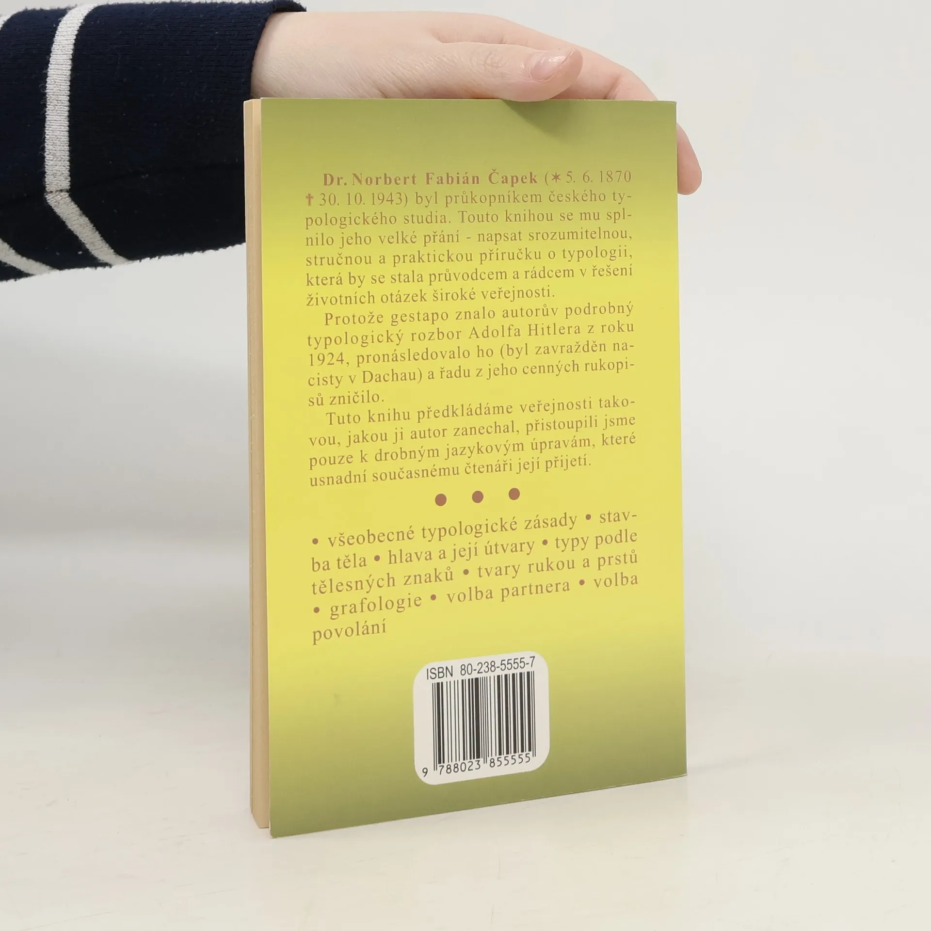 Praktické návody pro poznávání člověka. Dr. Norbert Fabián Čapek byl průkopníkem českého typologického studia. Touto knihou se mu splnilo velké přání - napsat srozumitelnou, stručnou příručku o typologii, která by se stala průvodcem a rádcem v řešení otázek široké veřejnosti. Protože gestapo znalo podrobný autorův typologický rozbor Adolfa Hitlera z roku 1924, pronásledovalo ho, byl zavražděn nacisty v Dachau.