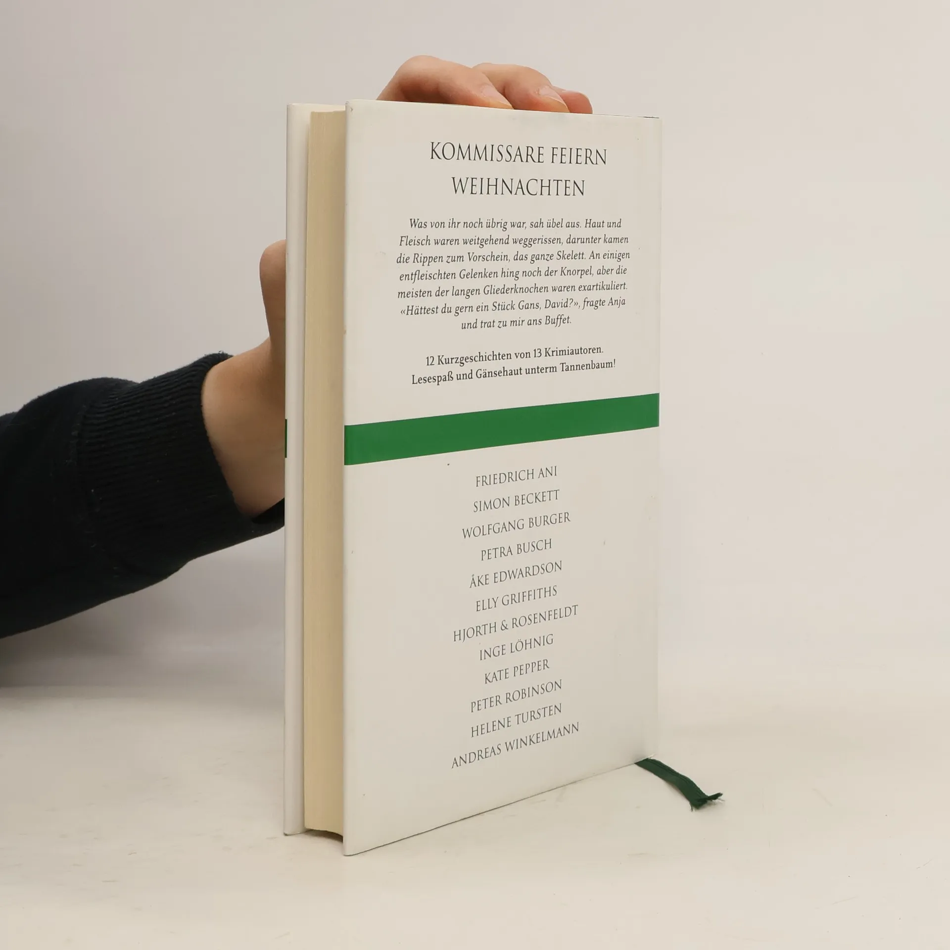 Kommissare feiern Weihnachten Was von ihr noch übrig war, sah übel aus. Haut und Fleisch waren weitgehend weggerissen, darunter kamen die Rippen zum Vorschein, das ganze Skelett. An einigen entfleischten Gelenken hing noch der Knorpel, aber die meisten der langen Gliederknochen waren exartikuliert. «Hättest du gern ein Stück Gans, David?», fragte Anja und trat zu mir ans Buffet.12 Kurzgeschichten von 13 Krimiautoren. Lesespaß und Gänsehaut unterm Tannenbaum!Friedrich AniSimon BeckettWolfgang BurgerPetra BuschÅke EdwardsonElly GriffithsHjorth & RosenfeldtInge LöhnigKate PepperPeter RobinsonHelene TurstenAndreas Winkelmann