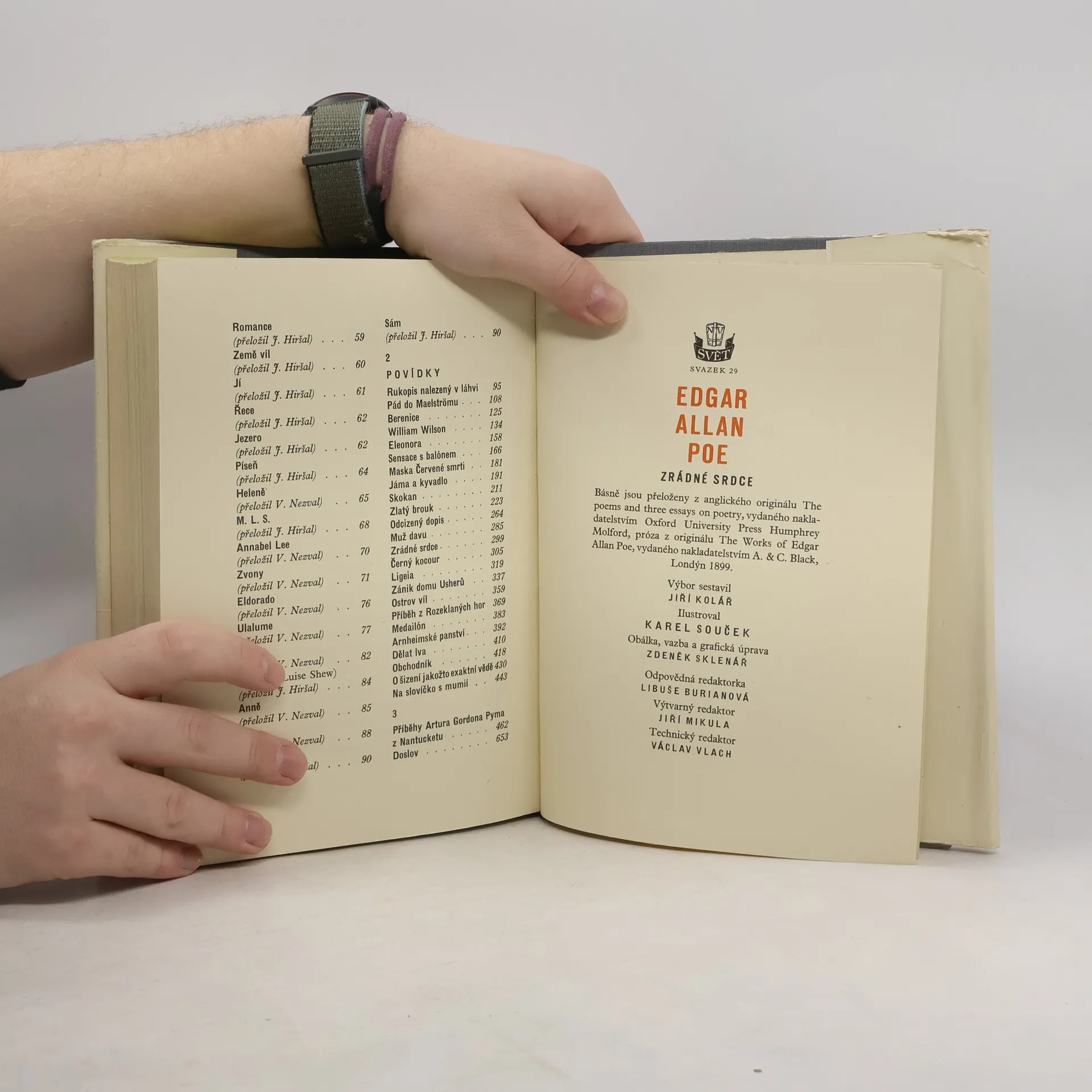 Obsahuje: Básně -- Povídky -- Příběhy Artura Gordona Pyma z Nantucketu (román). Výbor je zahájen sbírkou jeho lyrických básní, v nichž se obírá otázkou lidských citů, života a smrti, opěvuje romanticko zidealizovanou přírodu. Stejnou básnivost najdeme i v jeho próze. S hýřivou fantazií staví před oči čtenáře obrazy zidealizovaných krajin zejména v povídkách, či spíše v básních a v próze. Také v ostatních jeho prózách hrají barvité popisy, často až pedantsky, velkou roli. Povídky je možno rozdělit v několik skupin: především jsou to temné příběhy, povídky detektivního rázu a fantastické cestopisy.