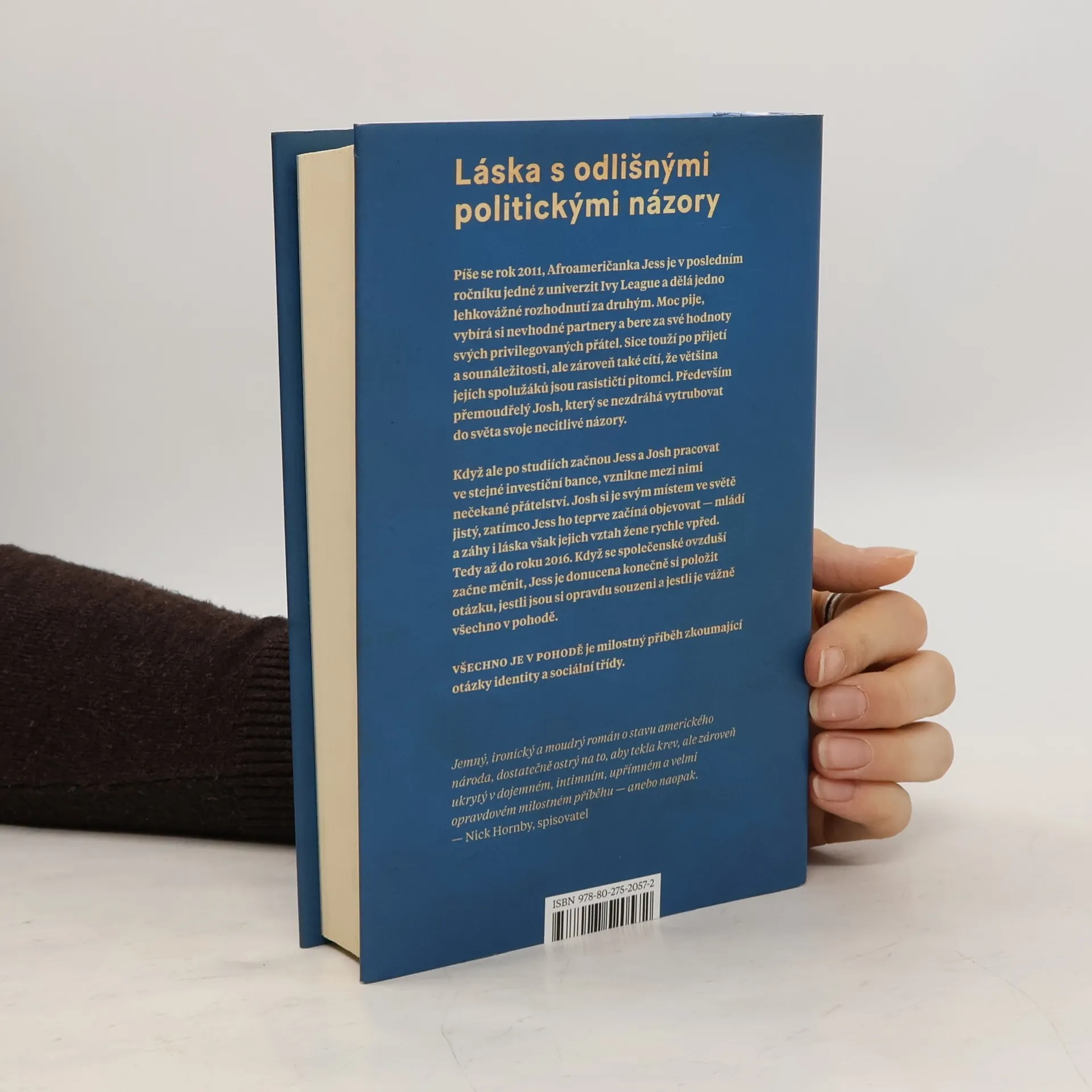 Láska s odlišnými politickými názory. Píše se rok 2011, Afroameričanka Jess je v posledním ročníku jedné z univerzit Ivy League a dělá jedno lehkovážné rozhodnutí za druhým. Moc pije, vybírá si nevhodné partnery a bere za své hodnoty svých privilegovaných přátel. Sice touží po přijetí a sounáležitosti, ale zároveň také cítí, že většina jejích spolužáků jsou rasističtí pitomci. Především přemoudřelý Josh, který se nezdráhá vytrubovat do světa svoje necitlivé názory. Když však po studiích začnou Jess a Josh pracovat ve stejné investiční bance, vznikne mezi nimi nečekané přátelství. Josh si je svým místem ve světě jistý, Jess ho teprve začíná objevovat mládí a záhy také láska však jejich vztah žene rychle vpřed. Tedy až do roku 2016. Když se společenské ovzduší začne měnit, Jess je donucena konečně si položit otázku, jestli jsou si opravdu souzeni a jestli je vážně všechno v pohodě. Všechno je v pohodě je milostný příběh, který zkoumá otázky identity a sociální třídy.