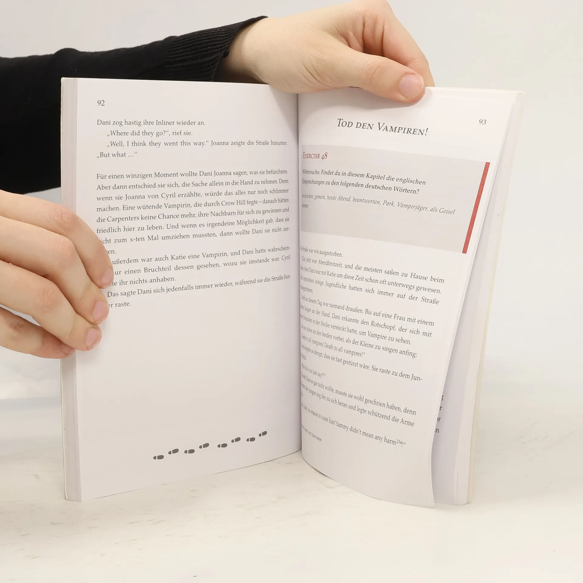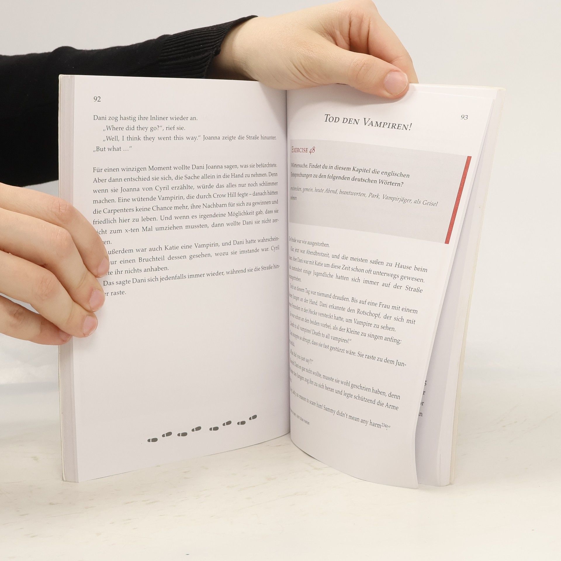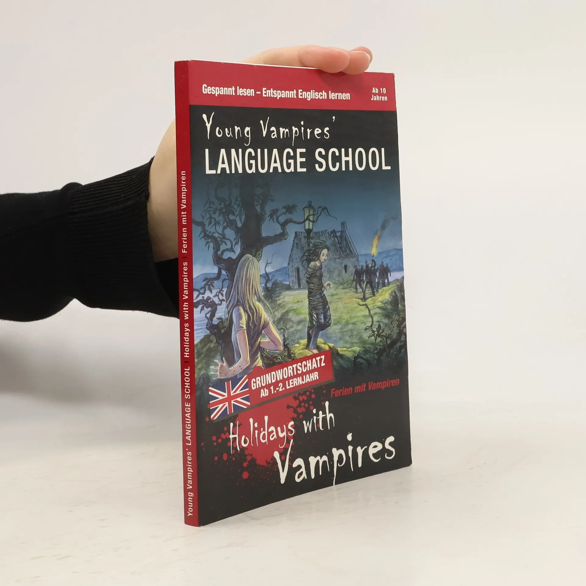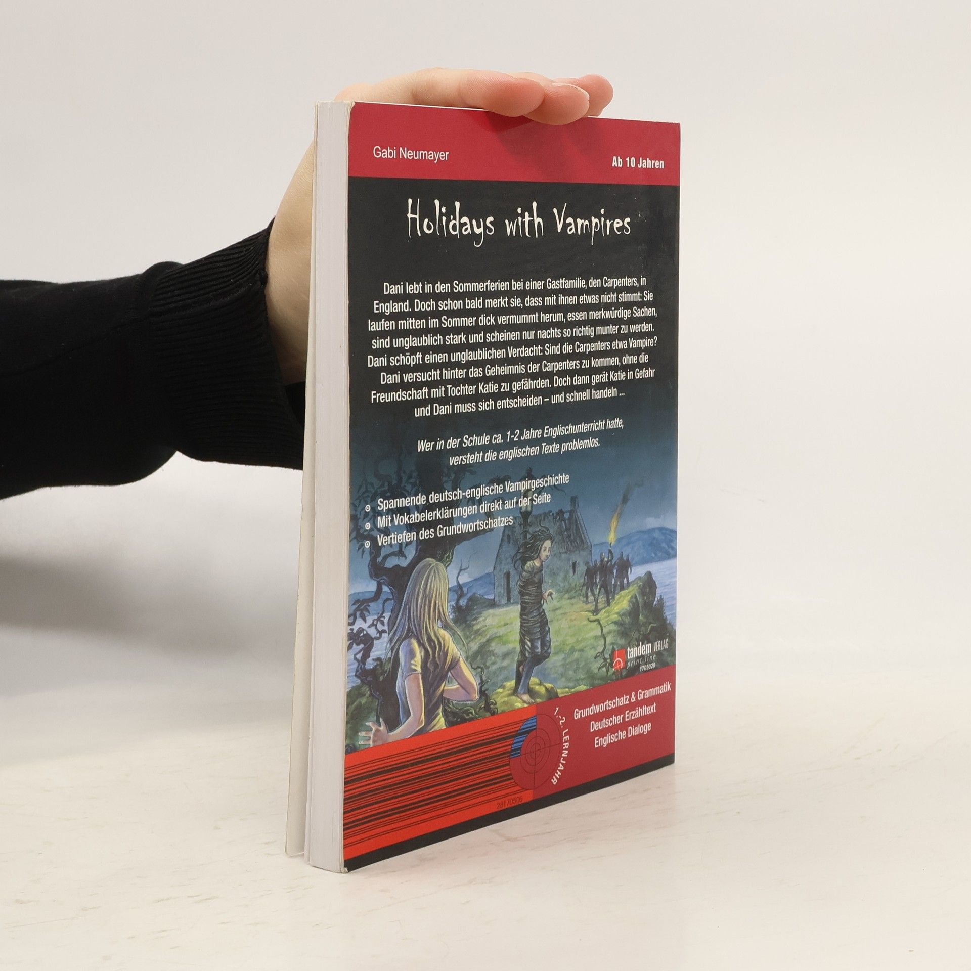 YOUNG VAMPIRES’ LANGUAGE SCHOOL: Holidays with Vampires Diese Reihe englischsprachiger Vampirgeschichten bietet spannende Storys und intensives Englisch-Training zugleich. Im Laufe der Handlung sind zahlreiche Lernübungen eingestreut, die man zwischendurch bearbeiten kann. Auf diese Weise wird das Gelesene vertieft und der Lernfortschritt überprüft. Der Band „Holidays with Vampires“ ist für Einsteiger (ab 1./2. Lernjahr) konzipiert: In einen deutschsprachigen Erzähltext sind englische Dialoge eingebettet. Inhalt: Dani lebt in den Sommerferien bei einer Gastfamilie, den Carpenters, in England. Doch schon bald merkt sie, dass mit ihnen etwas nicht stimmt: Sie laufen mitten im Sommer dick vermummt herum, essen merkwürdige Sachen, sind unglaublich stark und scheinen nur nachts so richtig munter zu werden. Dani schöpft einen unglaublichen Verdacht: Sind die Carpenters etwa Vampire? Dani versucht hinter das Geheimnis der Carpenters zu kommen, ohne die Freundschaft mit Tochter Katie zu gefährden. Doch dann gerät Katie in Gefahr und Dani muss sich entscheiden - und schnell handeln. Schwierige Vokabeln werden am Seitenende übersetzt. Ein Abschlussquiz stellt Fragen zur Handlung. Hier kann man im Selbsttest prüfen, ob man die Handlung verstanden hat. Fremdsprachenkenntnisse auf unterhaltsame Weise verbessern, nach dem Motto: Spannende Geschichten lesen – entspannt Englisch lernen.