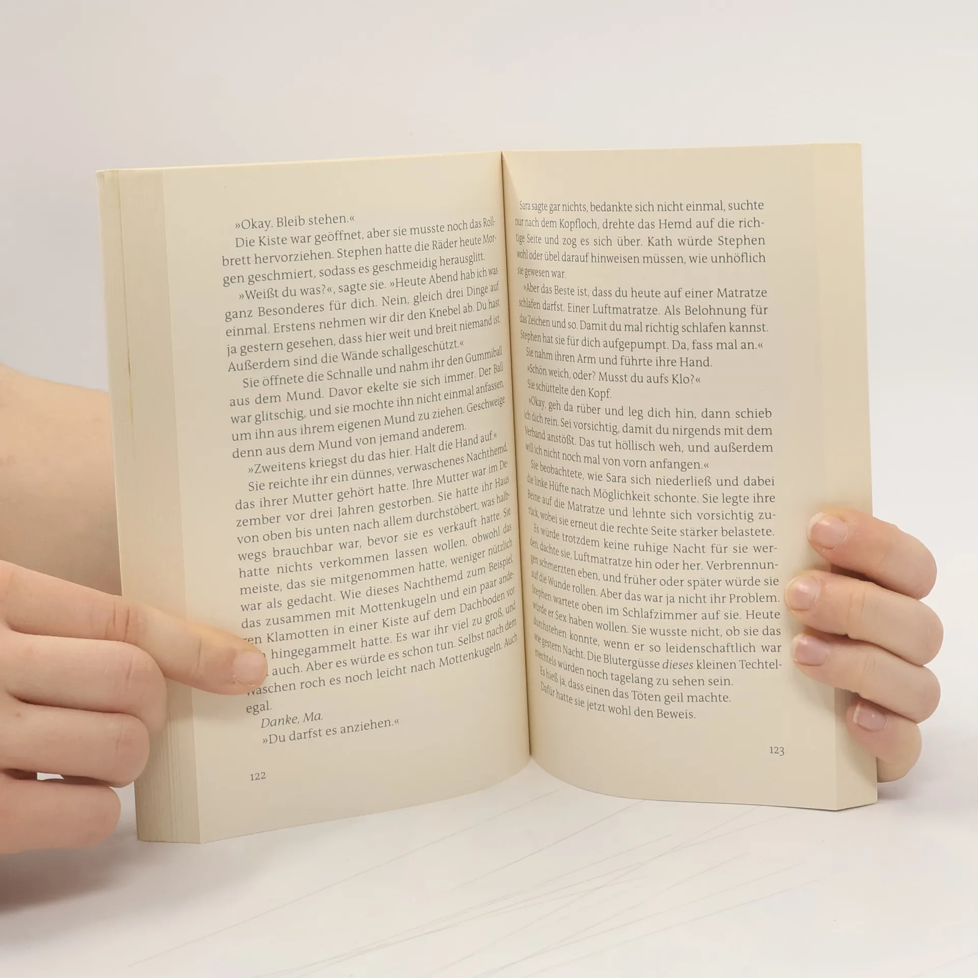 »Ihr erster Gedanke war, dass man sie lebendig begraben hatte. Dass sie sich in einem Sarg befand. Unter ihrem Rücken spürte sie Holz, und dicke Bretter auch zu ihrer Linken und zu ihrer Rechten, so nah, dass sie gerade noch den Arm heben konnte, um zu erfühlen, dass auch über ihr Holz war. Nie zuvor hatte sie Angst vor engen Räumen gehabt. Doch dieser Raum machte ihr große Angst.«