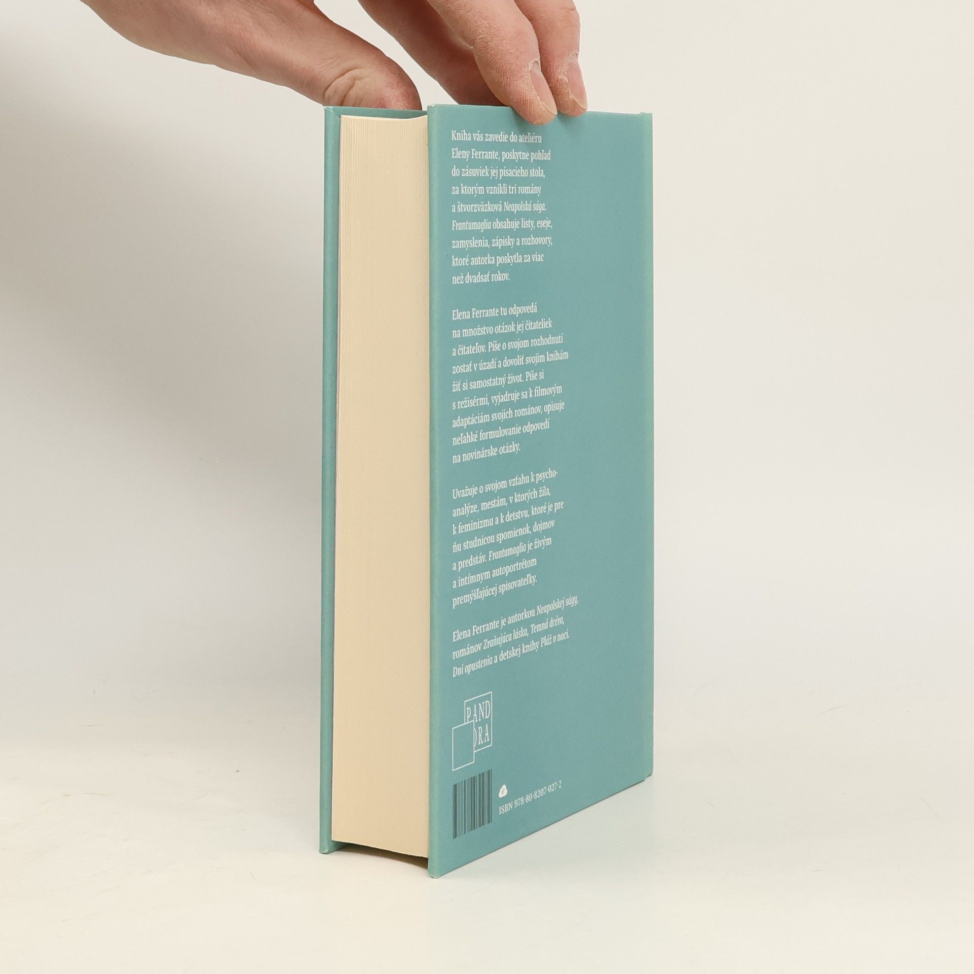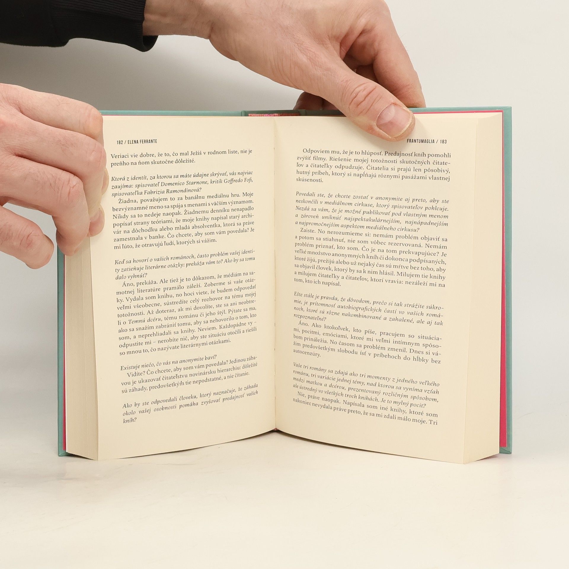 Táto kniha vás zavedie do ateliéru Eleny Ferrante, poskytne pohľad do zásuviek jej písacieho stola, za ktorým vznikli tri romány a štvorzväzková Neapolská sága. Frantumaglia obsahuje listy, eseje, zamyslenia, zápisky a rozhovory, ktoré autorka poskytla za viac než dvadsať rokov. Elena Ferrante tu odpovedá na množstvo otázok jej čitateliek a čitateľov. Píše o svojom rozhodnutí zostať v úzadí a dovoliť svojim knihám žiť si samostatný život. Píše si s režisérmi, vyjadruje sa k filmovým adaptáciám svojich románov, opisuje neľahké formulovanie odpovedí na novinárske otázky. Uvažuje o svojom vzťahu k psychoanalýze, mestám, v ktorých žila, k feminizmu a k detstvu, ktoré je pre ňu studnicou spomienok, dojmov a predstáv. Frantumaglia je živým a intímnym autoportrétom premýšľajúcej spisovateľky.