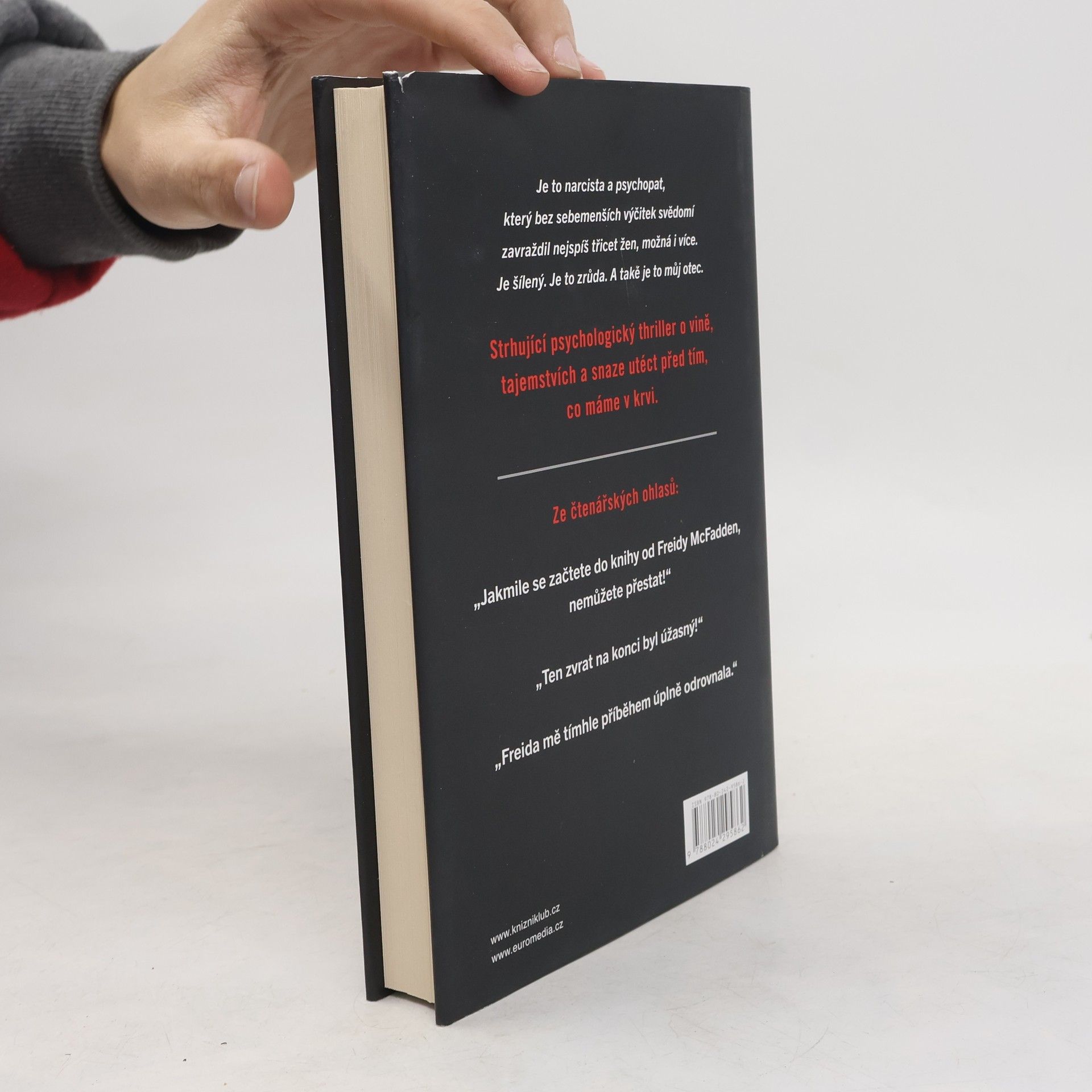Když si Nora Davisová dělala jako malá v pokojíčku úkoly, netušila, že její otec zatím ve sklepě vraždí ženy. Až do dne, kdy se jim u dveří objevila policie. O desítky let později je Nořin otec stále za mřížemi a ona je úspěšná chirurgyně s poklidným a osamělým životem. Nikdo netuší, že její otec byl sériový vrah. Pak však Nora zjistí, že jedna z jejích pacientek byla zavražděna – a to stejně děsivým a jedinečným způsobem, jakým vraždil i její otec. Někdo ví, kdo Nora je, a chce, aby za ten hrůzný zločin nesla zodpovědnost. Jenže ona není vrah. Policie jí nemůže nic přišít. Pokud se jí tedy někdo nepodívá do sklepa…