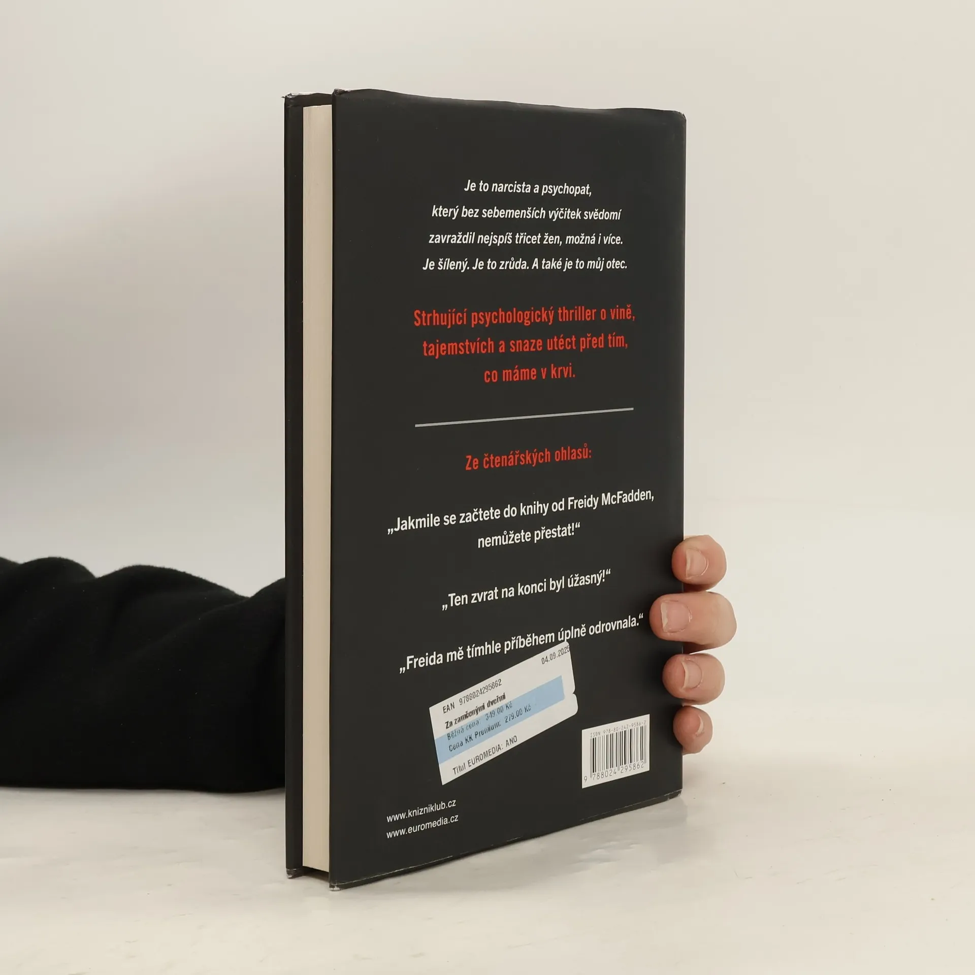 Když si Nora Davisová dělala jako malá v pokojíčku úkoly, netušila, že její otec zatím ve sklepě vraždí ženy. Až do dne, kdy se jim u dveří objevila policie. O desítky let později je Nořin otec stále za mřížemi a ona je úspěšná chirurgyně s poklidným a osamělým životem. Nikdo netuší, že její otec byl sériový vrah. Pak však Nora zjistí, že jedna z jejích pacientek byla zavražděna – a to stejně děsivým a jedinečným způsobem, jakým vraždil i její otec. Někdo ví, kdo Nora je, a chce, aby za ten hrůzný zločin nesla zodpovědnost. Jenže ona není vrah. Policie jí nemůže nic přišít. Pokud se jí tedy někdo nepodívá do sklepa…