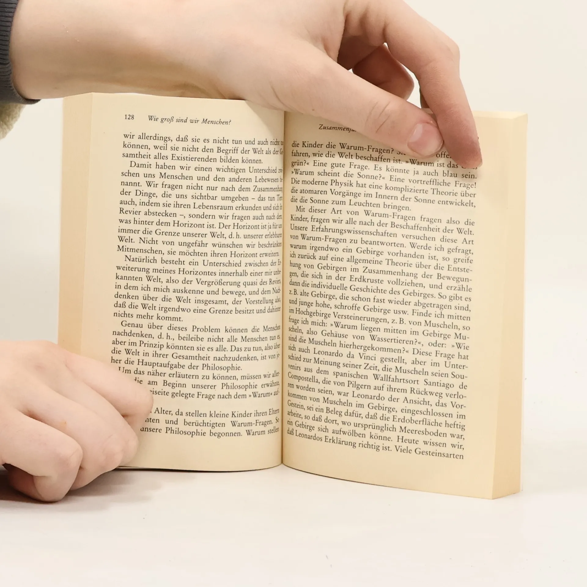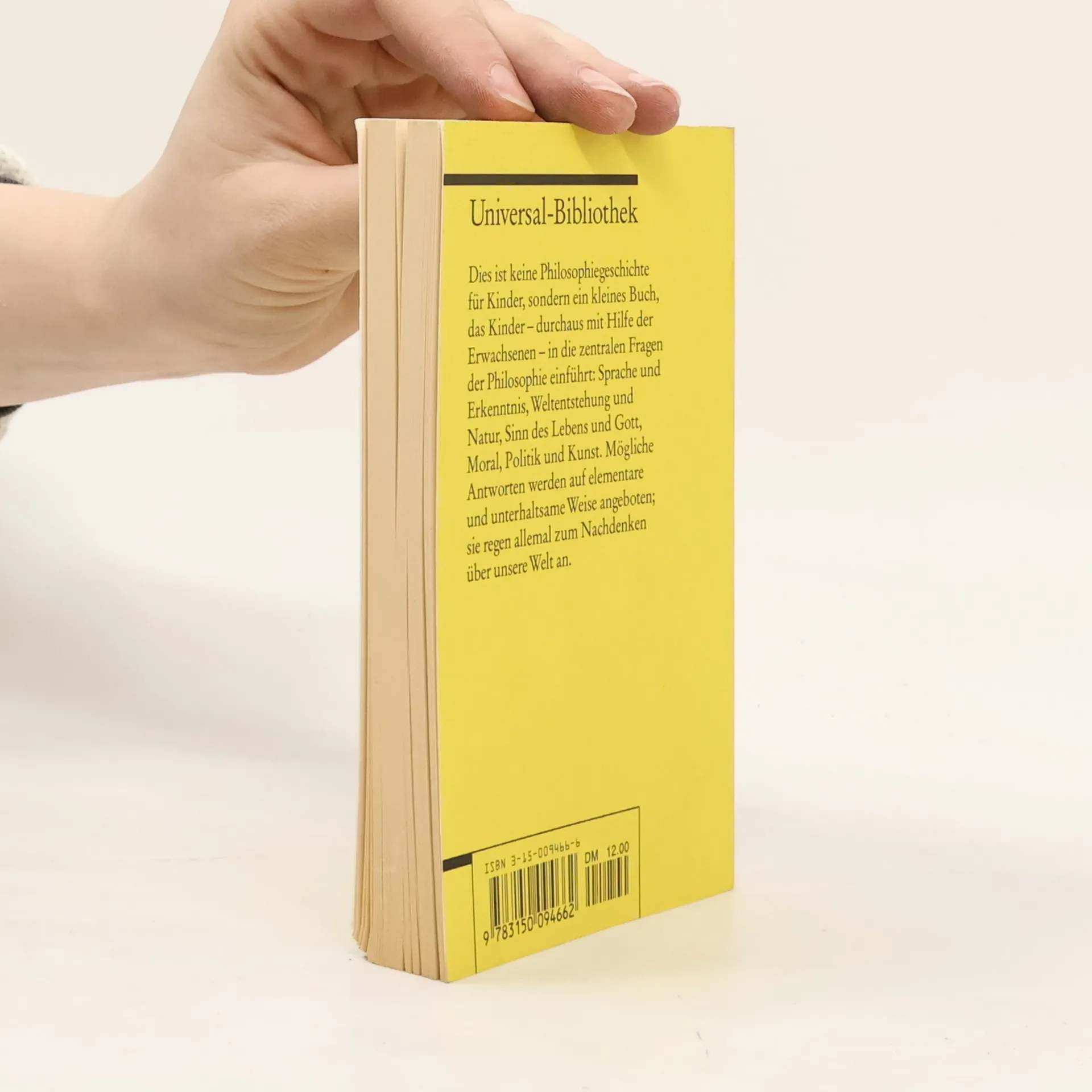Dies ist keine Philosophiegeschichte für Kinder, sondern ein kleines Buch, das Kinder - durchaus mit Hilfe der Erwachsenen - in die wesentlichen Themen der Philosophie einführt: Sprache und Erkenntnis, Weltentstehung und Natur, Sinn des Lebens und Gott, Moral, Politik und Kunst. Die Darstellung des Braunschweiger Philosophiedozenten ist elementar und unterhaltsam, ohne unzuverlässig zu vereinfachen; sie regt zum Nachdenken an über unsere Welt, in der Kinder und Erwachsene gemeinsam grundlegende Fragen stellen - und hier die Antworten der Philosophie erhalten. Die einzelnen Kapitel: Woher stammen die Wörter? - Woher stammen die Bedeutungen der Wörter? - Der Ursprung unseres Wissens - Die Entwicklung unseres Bildes von der Welt - Das Größte und das Kleinste - Wie groß sind wir Menschen? - Die Frage nach dem Sinn - Die Suche nach der richtigen Gesellschaftsordnung.