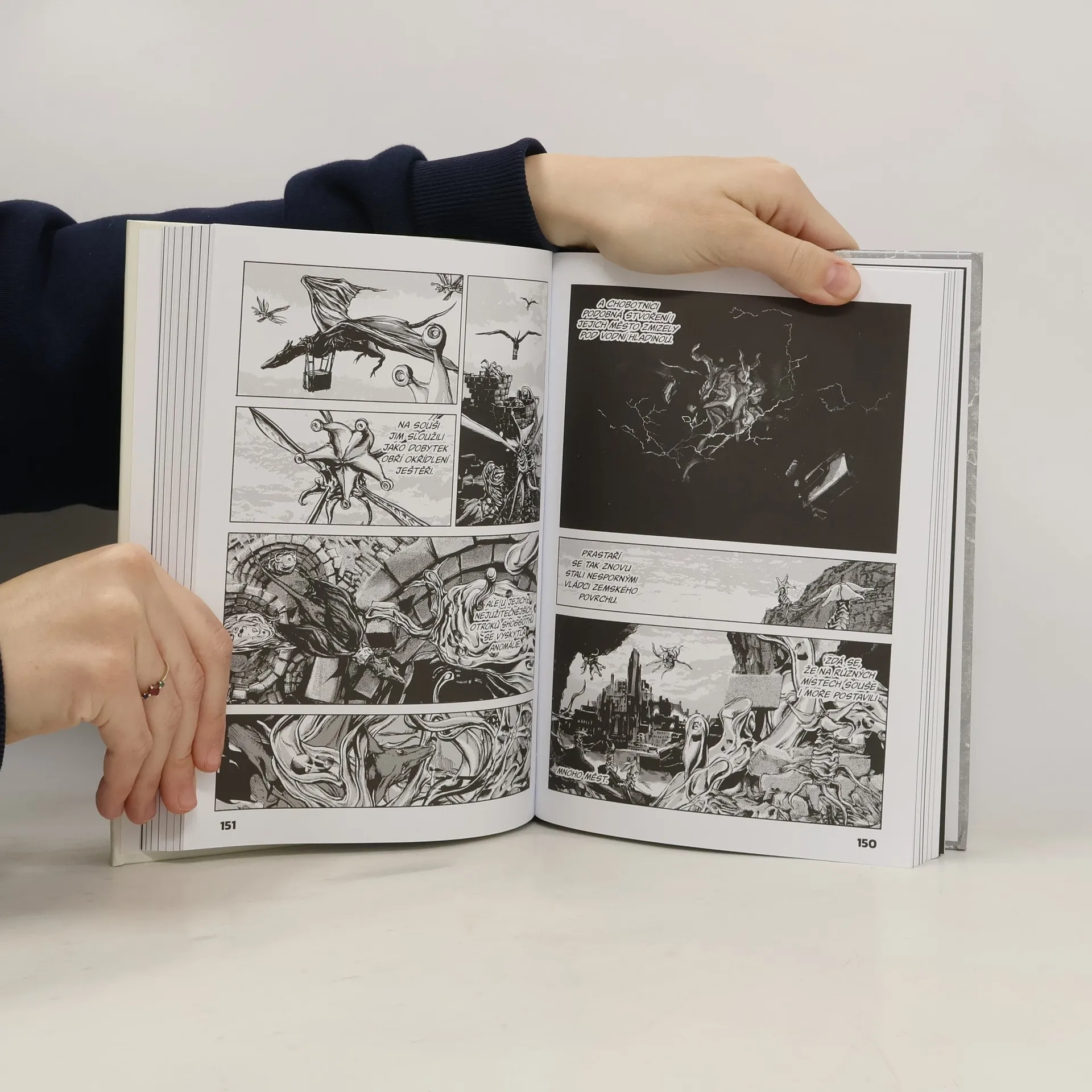 Dyer a Danforth z výzkumného týmu Miskatonické univerzity proletí malým letadlem neznámým antarktickým pohořím a přistanou, aby prozkoumali obrovské kyklopské cizí město, které se nachází za ním. Zde konečně odhalí ohavné tajemství veškerého života na Zemi... Ale podaří se jim uniknout z těchto nejzazších slují na dně světa a zachovat si dostatek zdravého rozumu, aby mohli varovat lidstvo...?Japonský scenárista a kreslíř Gó Tanabe v tomto druhém svazku své komiksové adaptace románu V horách šílenství uzavírá nervy drásající vyprávění, jež se na poli science fiction a hororu stalo klasikou a právem vyneslo autora předlohy, H. P. Lovecrafta, mezi mistry žánru.