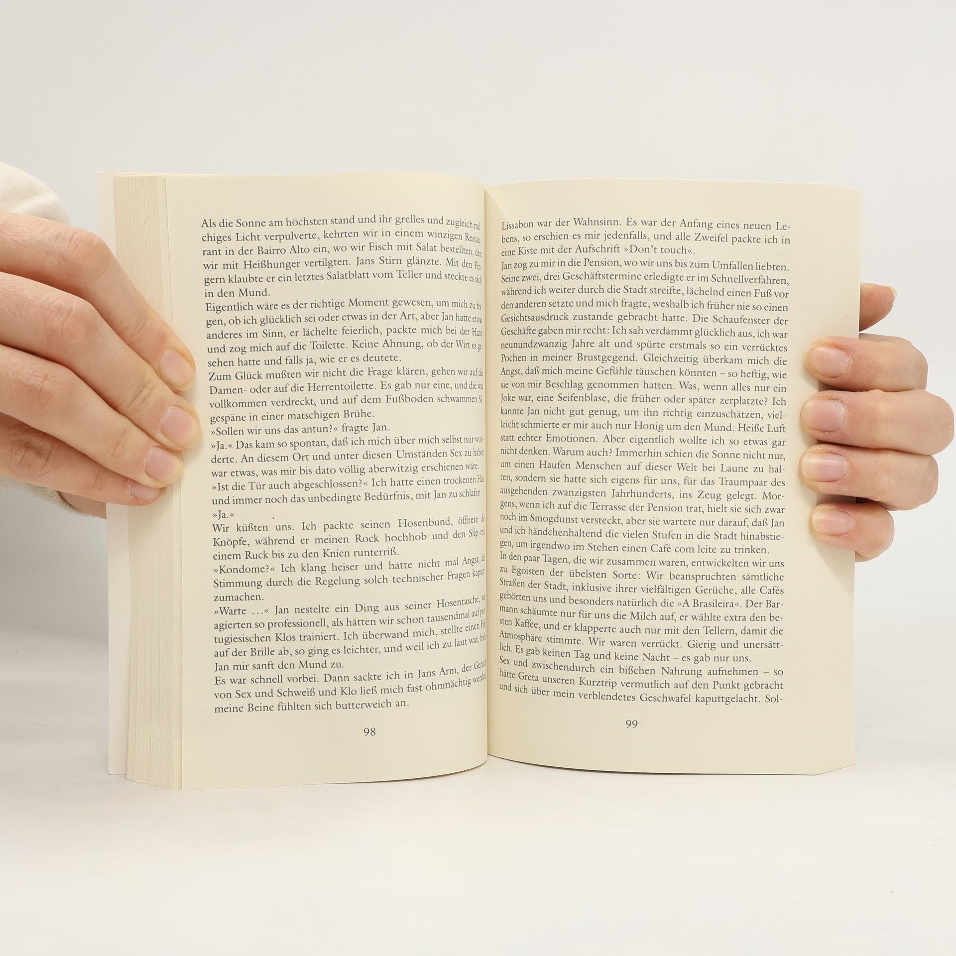Die 29jährige Katja lebt seit acht Jahren mit Tom zusammen. Eine Beziehung wie eingeschlafene Füße, schon länger geht jeder seiner Wege. Dann lernt Katja Jan kennen: ein Blickkontakt in der U-Bahn. Wenig später trifft sie den charismatischen Mann auf einem Fest wieder und läßt sich von ihm den Kopf verdrehen. Dabei sind die Konstellationen mehr als ungünstig: Jan ist nicht nur verheiratet, er hat auch drei kleine Kinder. Trotzdem nimmt die leidenschaftliche Affäre ihren Lauf, Katja folgt Jan auf eine erotische Odyssee nach Portugal und Italien und versucht zugleich ihre Karriere als Daily-Soap-Autorin ins Rollen zu bringen. Immer wieder funkt Hans, der Mann für alle Fälle, dazwischen, wodurch ihr Leben noch chaotischer wird. Hin- und hergerissen zwischen den beiden Männern, taumelt Katja durch die schönsten Cafés Europas, von deren Erotik sie sich magisch angezogen fühlt. Ein unkonventioneller Roman über Sex, Liebe und Freundschaft.