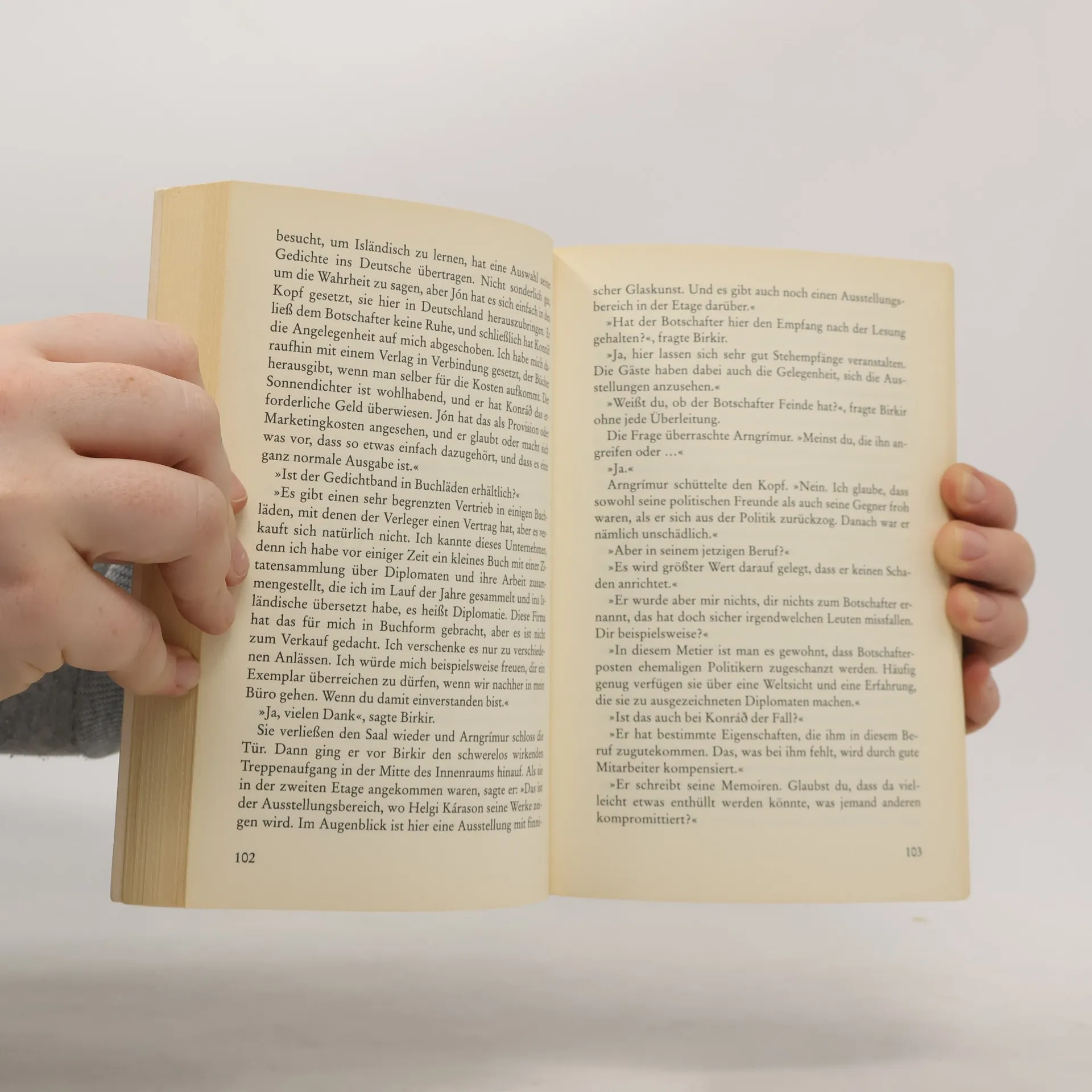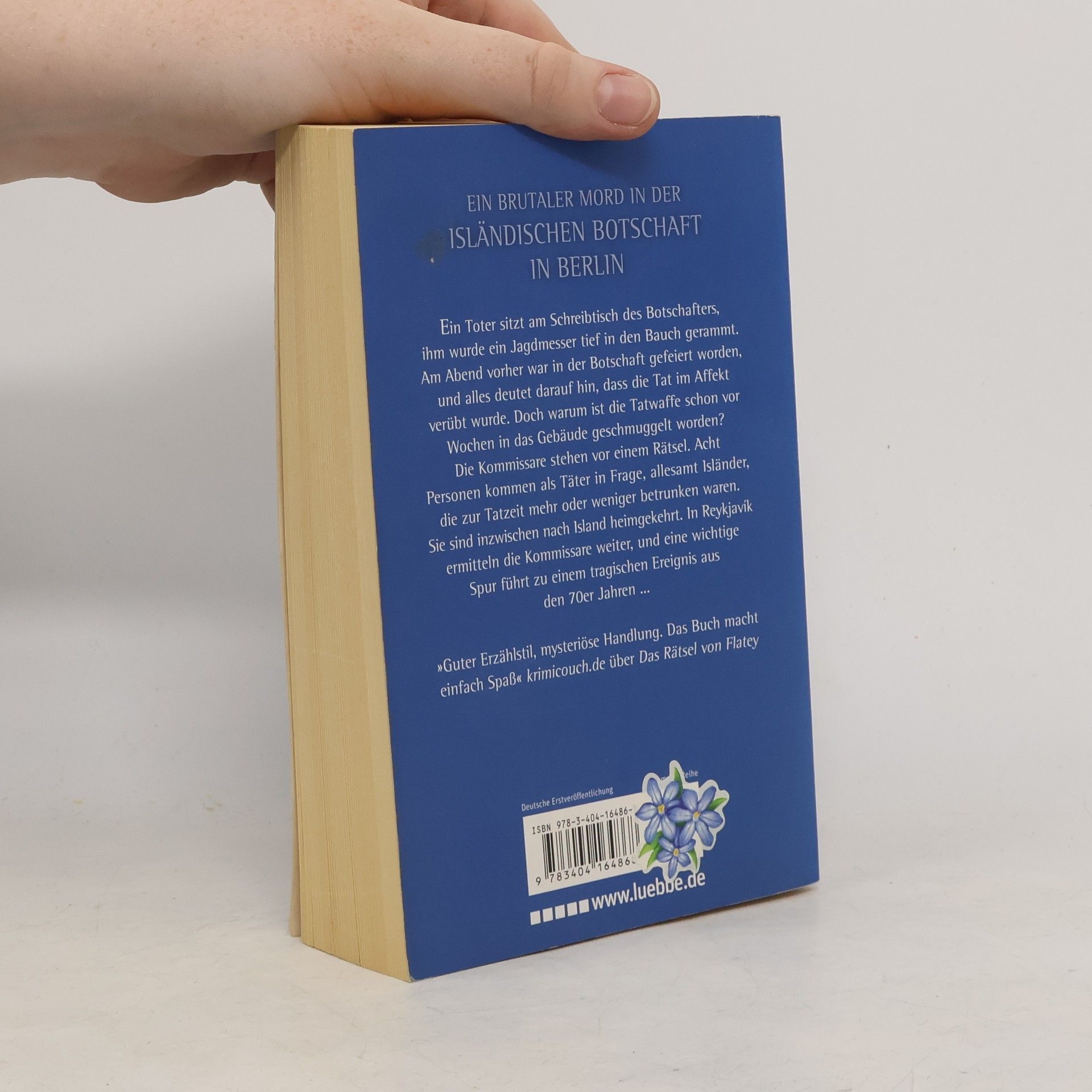 Ein Toter sitzt am Schreibtisch des Botschafters, ihm wurde ein Jagdmesser tief in den Bauch gerammt. Am Abend vorher war in der Botschaft gefeiert worden, und alles deutet darauf hin, dass die Tat im Affekt verübt wurde. Doch warum ist die Tatwaffe schon vor Wochen in das Gebäude geschmuggelt worden? Die Kommissare stehen vor einem Rätsel. Acht Personen kommen als Täter in Frage, allesamt Isländer, die zur Tatzeit mehr oder weniger betrunken waren. Sie sind inzwischen nach Island heimgekehrt. In Reykjavík ermitteln die Kommissare weiter, und eine wichtige Spur führt zu einem tragischen Ereignis aus den 70er Jahren.