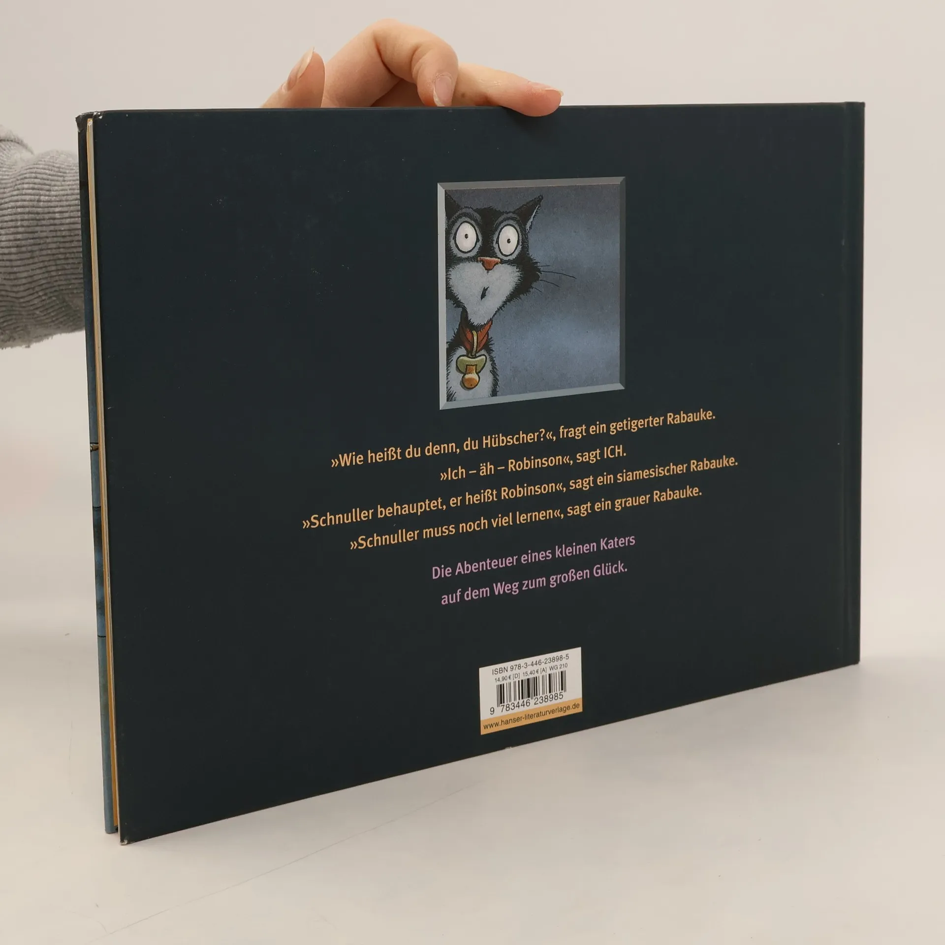 „Bitte schön, hier ist sie nun: die goldene Freiheit. Nur echt ohne Gebrauchsanweisung.“ Und deshalb ziemlich gefährlich. Manch eine andere Katze würde lieber zu Fressnapf und Frauchen zurückkehren, statt sich im Hafenviertel mit Metzgern und Ratten um ein mickriges Würstchen zu schlagen. Nicht so der Held in diesem Bilderbuch: Robinson. Er stürzt sich ins wilde Leben. Und sein Mut wird belohnt - mit der Liebe. Eine humorvolle Geschichte über den atemberaubenden Weg eines kleinen Katers zum großen Glück, ausgedacht und illustriert von Peter Schössow - mit einem Text von Harry Rowohlt.