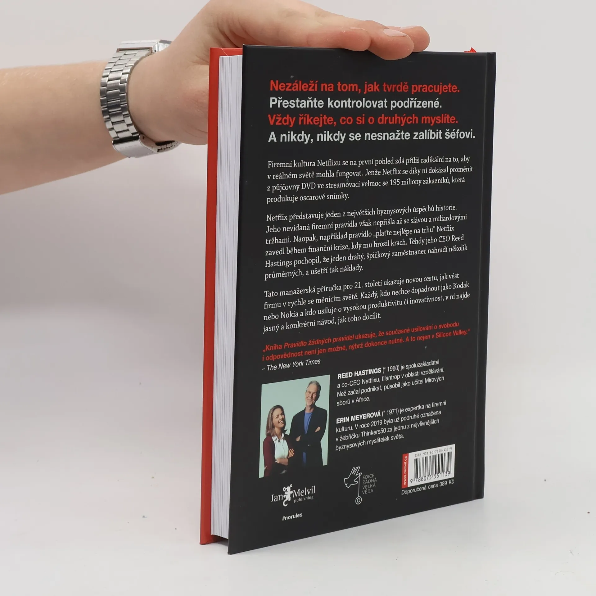 „Než přišel Netflix, nikdy předtím neexistovala společnost jako Netflix.“ Tato revoluční firma generuje miliardové roční příjmy a oslovuje stovky milionů lidí ve více než 190 zemích. Klíčovým faktorem úspěchu je kultura nastavená Reedem Hastingsem, která může na první pohled působit radikálně. Díky této kultuře zaměřené na svobodu a odpovědnost se Netflix dostal na vrchol. V tomto světovém bestselleru spoluzakladatel Hastings odhaluje vnitřní fungování Netflixu: jak nastavuje nové standardy, váží si lidí více než procesů, upřednostňuje inovace před efektivitou a zaměstnance nekontroluje. Neexistují žádná pravidla pro dovolenou ani výdaje. Zaměstnanci se nesnaží potěšit své nadřízené, ale poskytují upřímnou zpětnou vazbu. Tyto neobvyklé metody vedly k bezkonkurenční rychlosti inovací a Netflix se stal jednou z nejoblíbenějších značek na světě. Tato kniha je výbornou a čtivou byznysovou příručkou, která dramaticky proplétá historii Netflixu. Je určena pro ty, kdo vedou týmy, firmy, budují startupy nebo pracují v organizacích, které chtějí zlepšovat.