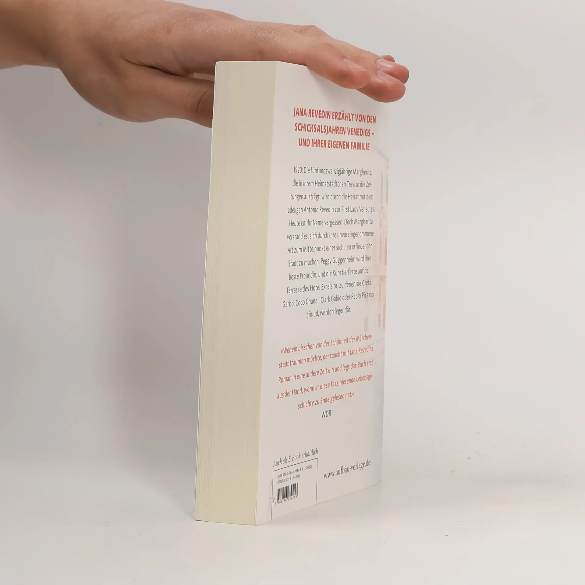 Jana Revedin erzählt von den Schicksalsjahren Venedigs – und ihrer eigenen Familie Für Peggy Guggenheim war sie die First Lady Venedigs. 1920: Die fünfundzwanzigjährige Margherita, die in ihrem Heimatstädtchen Treviso die Zeitungen austrägt, wird durch die Heirat mit dem adeligen Antonio Revedin zur First Lady Venedigs. Heute ist ihr Name vergessen: Doch Margherita verstand es, sich durch ihre unvoreingenommene Art zum Mittelpunkt einer sich neu erfindenden Stadt zu machen. Peggy Guggenheim wird ihre beste Freundin, und die Künstlerfeste auf der Terrasse des Hotel Excelsior, zu denen sie Greta Garbo, Coco Chanel, Clark Gable oder Pablo Picasso einlud, werden legendär. „Wer ein bisschen von der Schönheit der Märchenstadt träumen möchte, der taucht mit Jana Revedins Roman in eine andere Zeit ein und legt das Buch erst aus der Hand wenn er diese faszinierende Lebensgeschichte zu Ende gelesen hat.“ WDR