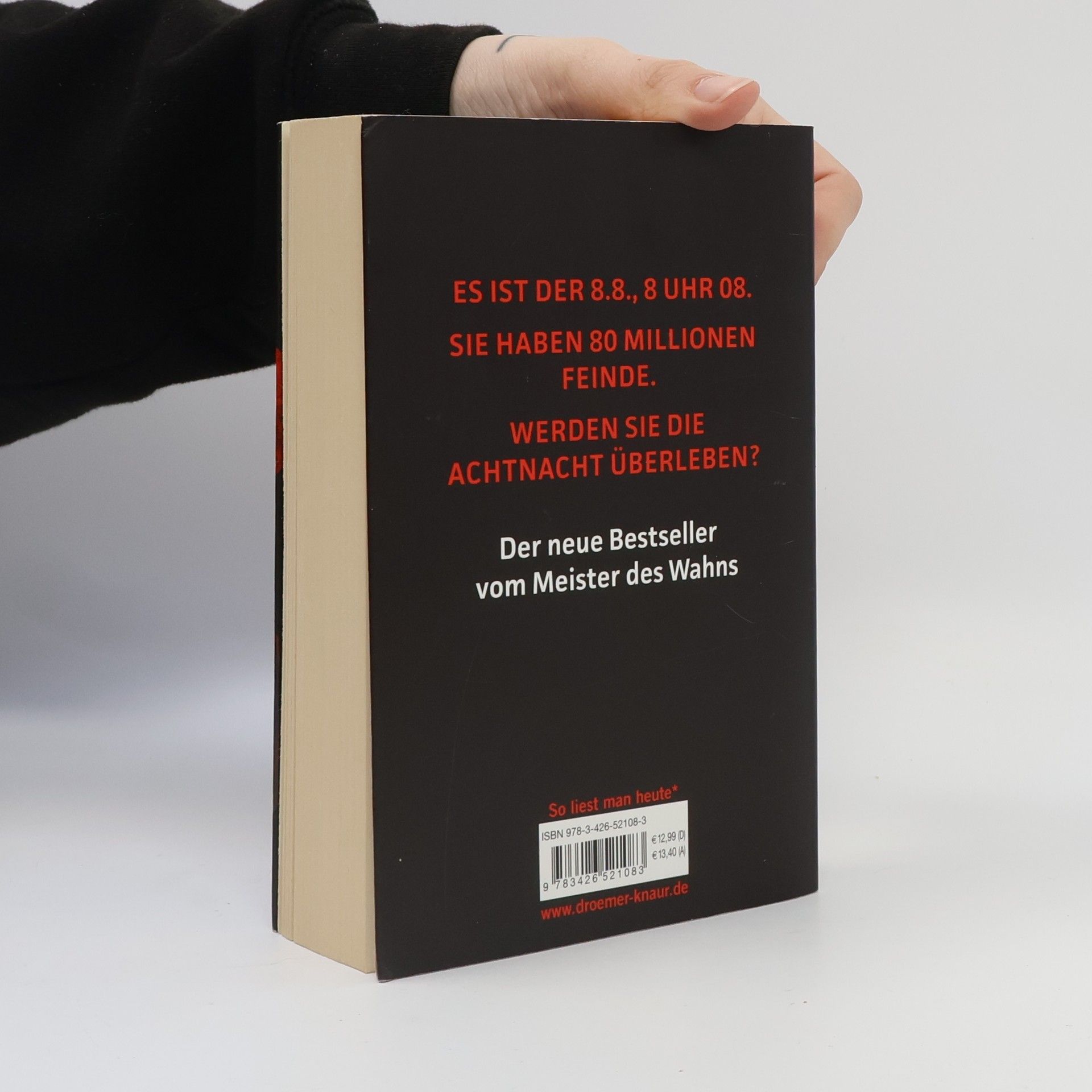 Ein furioser Thriller von Sebastian Fitzek, basierend auf einer großartigen Wahn-Idee: Was wäre, wenn du einen Menschen deiner Wahl straflos töten darfst? Es ist der 8. 8., acht Uhr acht. Du hast 80 Millionen Feinde. Wirst du die AchtNacht überleben? Stell dir vor, es gibt eine Todeslotterie. Du kannst den Namen eines verhassten Menschen in einen Lostopf werfen. In der „AchtNacht“, am 8. 8. jedes Jahres, wird aus allen Vorschlägen ein Name gezogen. Der Auserwählte ist eine AchtNacht lang geächtet, vogelfrei. Jeder in Deutschland darf ihn straffrei töten - und wird mit einem Kopfgeld von zehn Millionen Euro belohnt. Das ist kein Gedankenspiel. Sondern bitterer Ernst. Es ist ein massen-psychologisches Experiment, das aus dem Ruder lief. Und dein Name wurde gezogen! Ein rasanter Action-Thriller und Bestseller von Sebastian Fitzek, dem „Meister des Wahns“ – exklusiv im Taschenbuch.