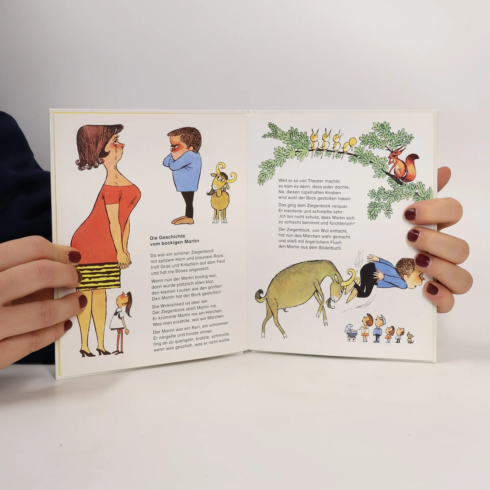 Na, was passiert wohl mit der dicken Angelika, die immer nur isst und faulenzt, mit Frank, der immer nur fernsehen will, mit Siegfried, der alles kaputt macht, Johannes, der herumstromert, dem Tierquäler Martin oder Sibylle, die nicht aufhört, an den Daumen zu lutschen? Irgendwann nimmt alles ein böses Ende, aber hier, in der berühmten Struwwelpeter-Version von Hansgeorg Stengel, lange nicht so böse wie beim Ur-Struwwelpeter. Die Daumen werden nicht abgeschnitten, sondern laufen höchstens weg, nicht die Kinder verbrennen beim Kokeln, sondern nur das Spielzeug und der Suppenkasper ist hier ein Mäkelfritze, der nicht verhungert, sondern vom ausschließlichen Stachelbeerenessen lauter Stacheln bekommt.