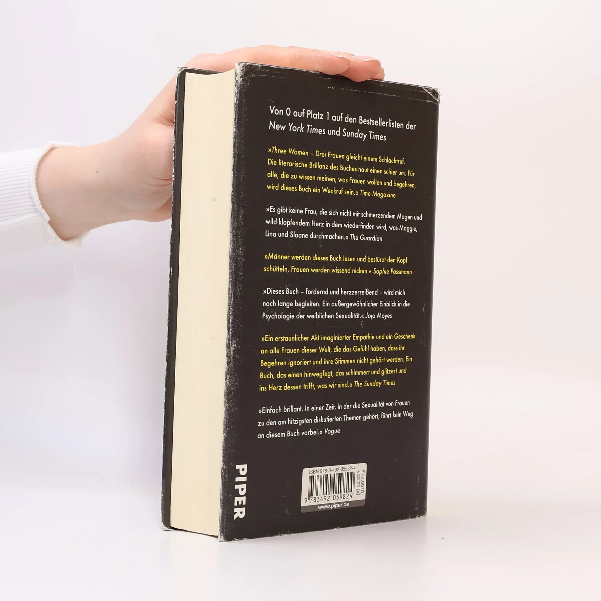 "Alles, was Lina will, ist, dass jemand sie begehrt. Wie ist sue in diese Ehe geraten, mit zwei Kindern und einem Mann, der sie nicht einmal mehr auf dem Mund küsst? Alles, was Maggie will, ist, dass jemand sie versteht. Wie konnte sie sich auf ihren Lehrer einlassen? Und warum scheinen alle nicht ihn, sondern sie dafür zu hassen? Alles, was Sloane will, ist, dass jemand sie bewundert. Wie ist sie zum Objekt der Begierde eines Mannes geworden, ihres Mannes, der nichts lieber tut, als ihr beim Sex mit anderen zuzuschauen? Three women - Drei Frauen ist das Buch der Stunde über weibliche Sexualität zwischen Lust und Macht, anziehend und verstörend, vielschichtig, gewaltig und schön"--Dust jacket flap