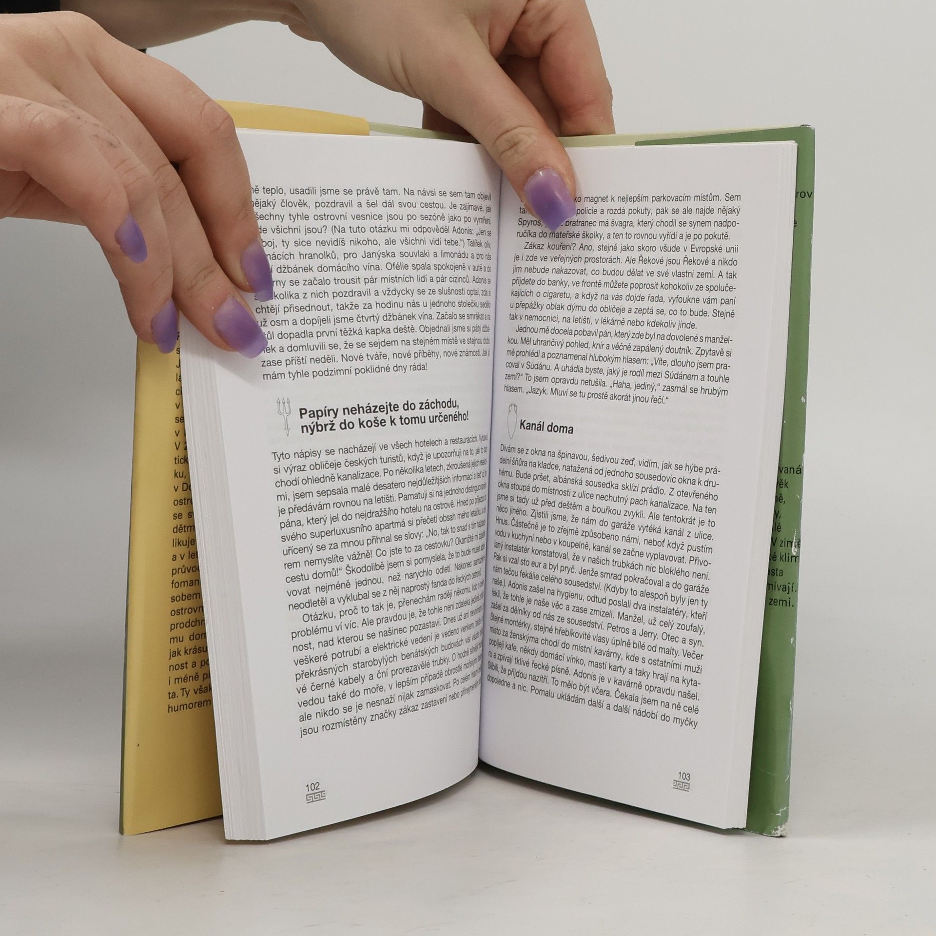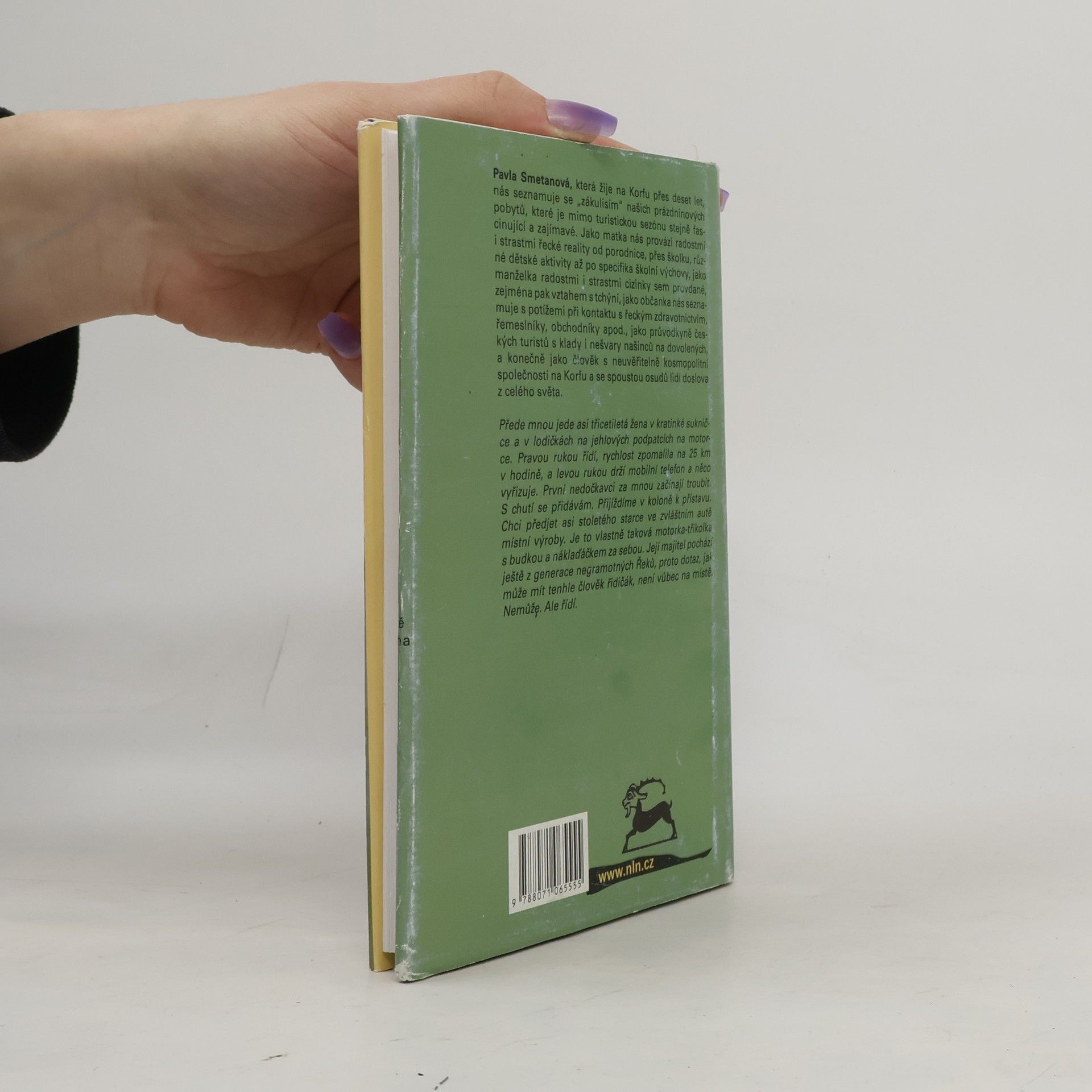 Autorka žije na Korfu přes deset let se svým řeckým manželem a dvěma dětmi. Její postřehy jsou prodchnuty láskou a obdivem k novému domovu, což jí umožňuje vnímat jak krásu a poezii celého ostrova či vlídnost a pohostinnost jeho obyvatel, tak i méně příjemné stránky zdejšího života. Ty však dokáže glosovat s laskavým humorem i s jistým pochopením....