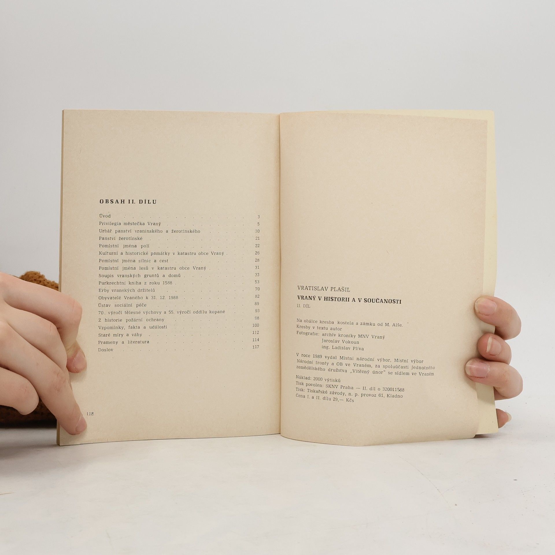 "Druhý díl knihy 'Vraný v historii a v současnosti' má za úkol seznámit čtenáře s historickými dokumenty velice důležitými pro život obyvatel městečka zejména v době středověku a později. Ať je to již 'Purkrechtní kniha', opis privilegií udělených a později potvrzených různými panovníky, soupis vranských gruntů, 'Urbář panství vraninského a žirotínského' z doby, kdy byli majiteli městečka Doupovci, či soupis pomístních jmen." Vratislav Plašil 1989