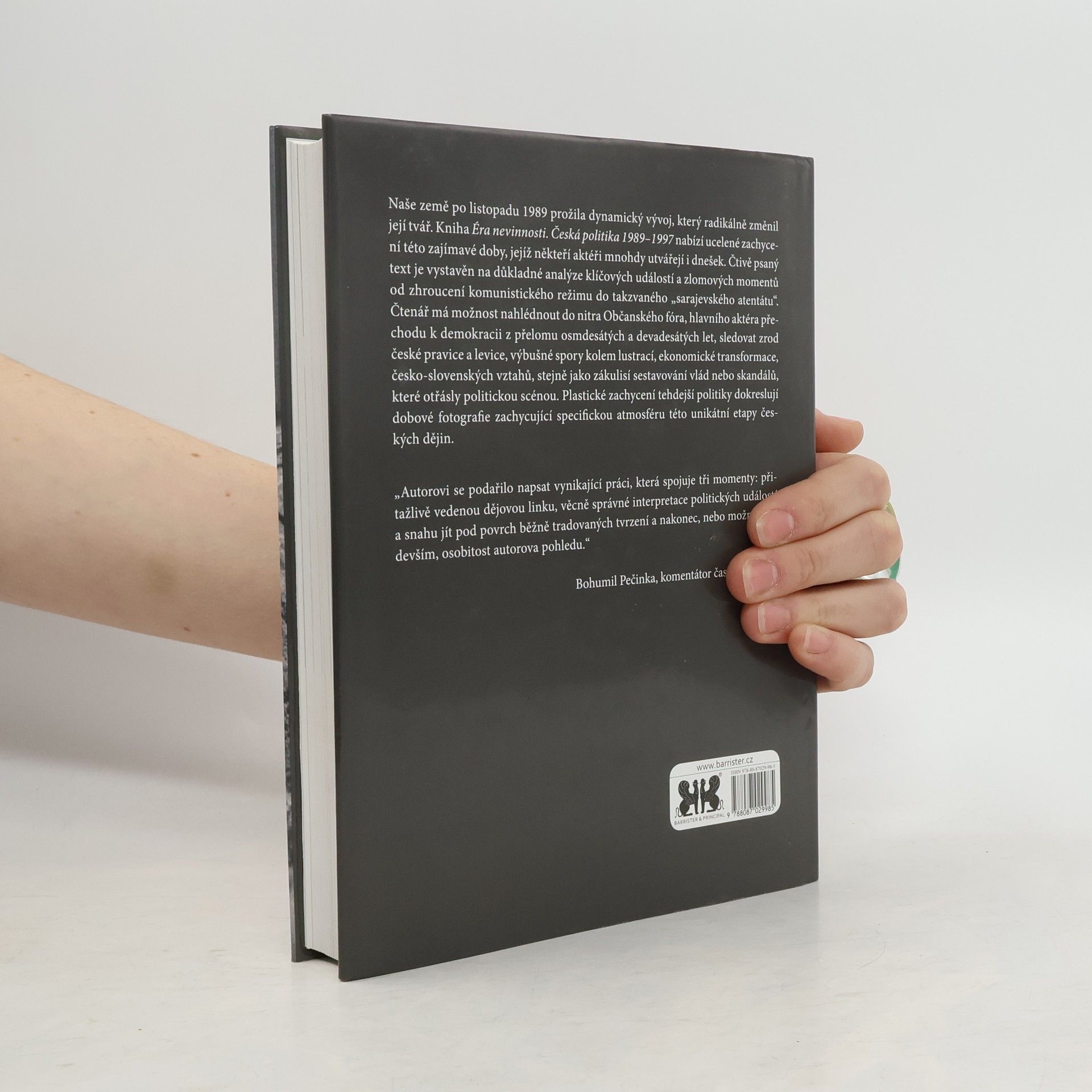 Česká politika 1989-1997. Naše země po listopadu 1989 prožila dynamický vývoj, který radikálně změnil její tvář. Kniha Éra nevinnosti. Česká politika 1989-1997 nabízí ucelené zachycení této zajímavé doby, jejíž někteří aktéři mnohdy utvářejí i dnešek. Čtivě psaný text je vystavěn na důkladné analýze klíčových událostí a zlomových momentů od zhroucení komunistického režimu do takzvaného \"sarajevského atentátu\". Čtenář má možnost nahlédnout do nitra Občanského fóra, hlavního aktéra přechodu k demokracii z přelomu osmdesátých a devadesátých let, sledovat zrod české pravice a levice, výbušné spory kolem lustrací, ekonomické transformace, česko-slovenských vztahů, stejně jako zákulisí sestavování vlád nebo skandálů, které otřásly politickou scénou. Plastické zachycení tehdejší politiky dokreslují dobové fotografie zachycující specifickou atmosféru této unikátní etapy českých dějin.