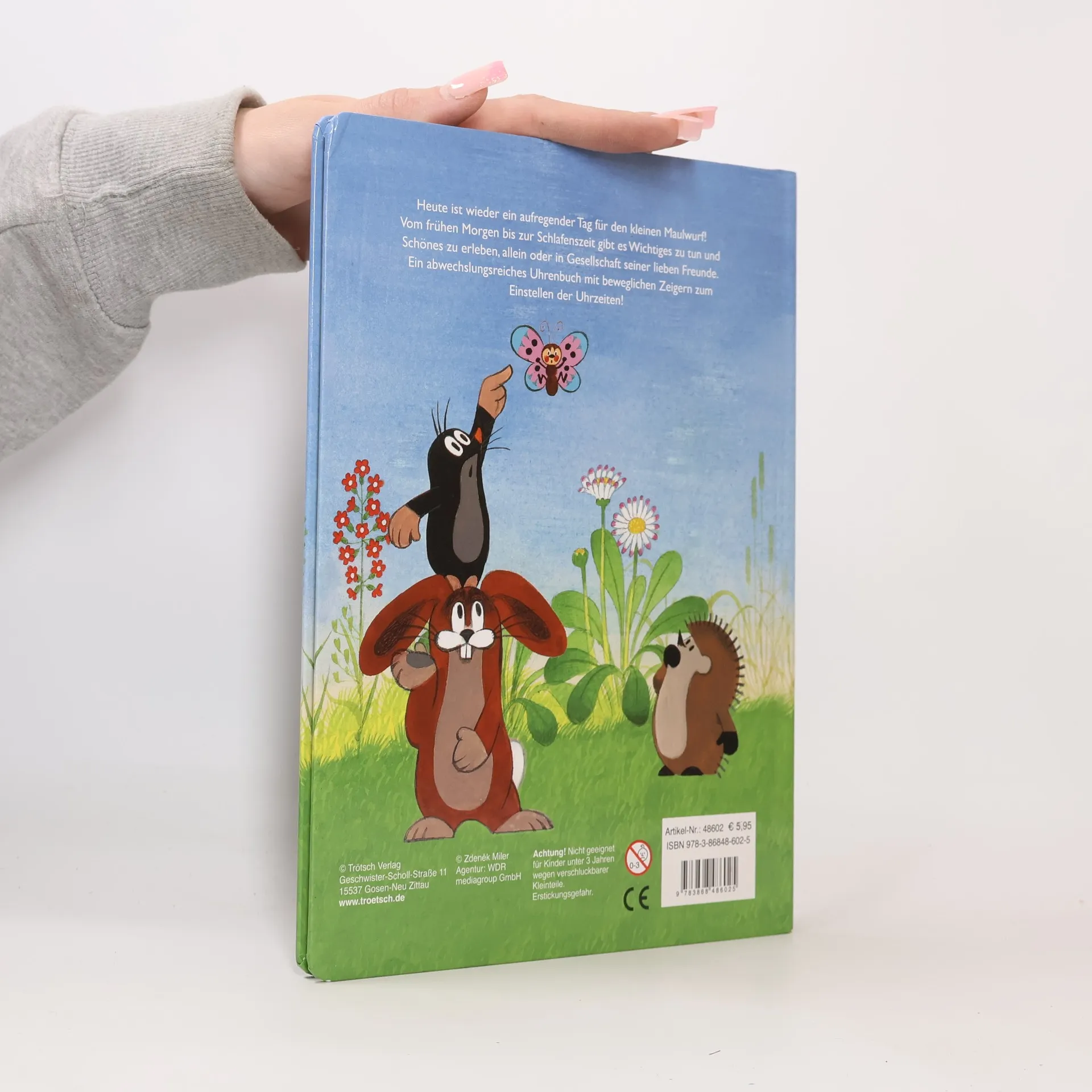 In diesem Uhrenbuch zeigen der Kleine Maulwurf und seine Freunden was sie alles erleben, vom frühen Morgen bis zur Schlafenszeit. Mit echtem Ziffernblatt und beweglichen Zeigern zum Nachstellen der Uhrzeiten.