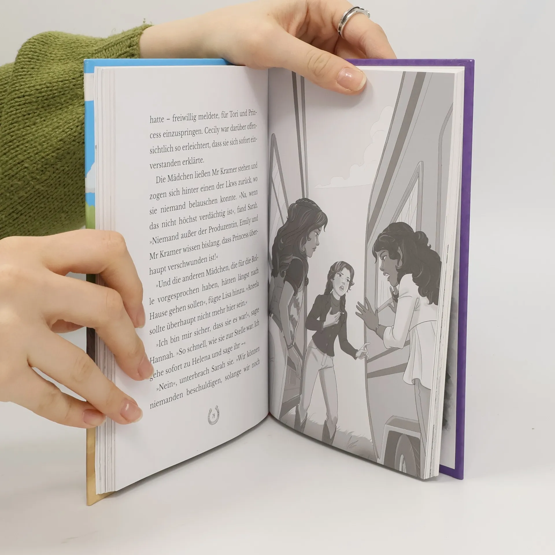 Auf dem Gestüt Lakeside soll ein Film gedreht werden und beinah hätte Hannah sogar eine Rolle ergattert. Doch die Siegerin des Castings gibt plötzlich auf und die 4 Freundinnen erfahren von einem Drohbrief und einem verschwundenen Pferd. Natürlich versucht der Horse-Club sofort denjenigen zu finden, der hinter dieser Intrige steckt. Endlich mal wieder ein Horse-Club-Buch, das nicht von der kleinen Schwester Mia handelt, sondern von den 4 Freundinnen des Horse-Clubs selbst! Es ist deshalb auch 3-mal so umfangreich wie sein Vorgänger, hat eine spannende und "erwachsenere" Handlung und die wenigen Zeichnungen sind in Schwarz-Weiss. Nichtsdestotrotz ein besserer Titel innerhalb der Reihe für ältere Pferdefreundinnen ab 8 Jahren. Wo die Reihe läuft, gern empfohlen. Ab 8