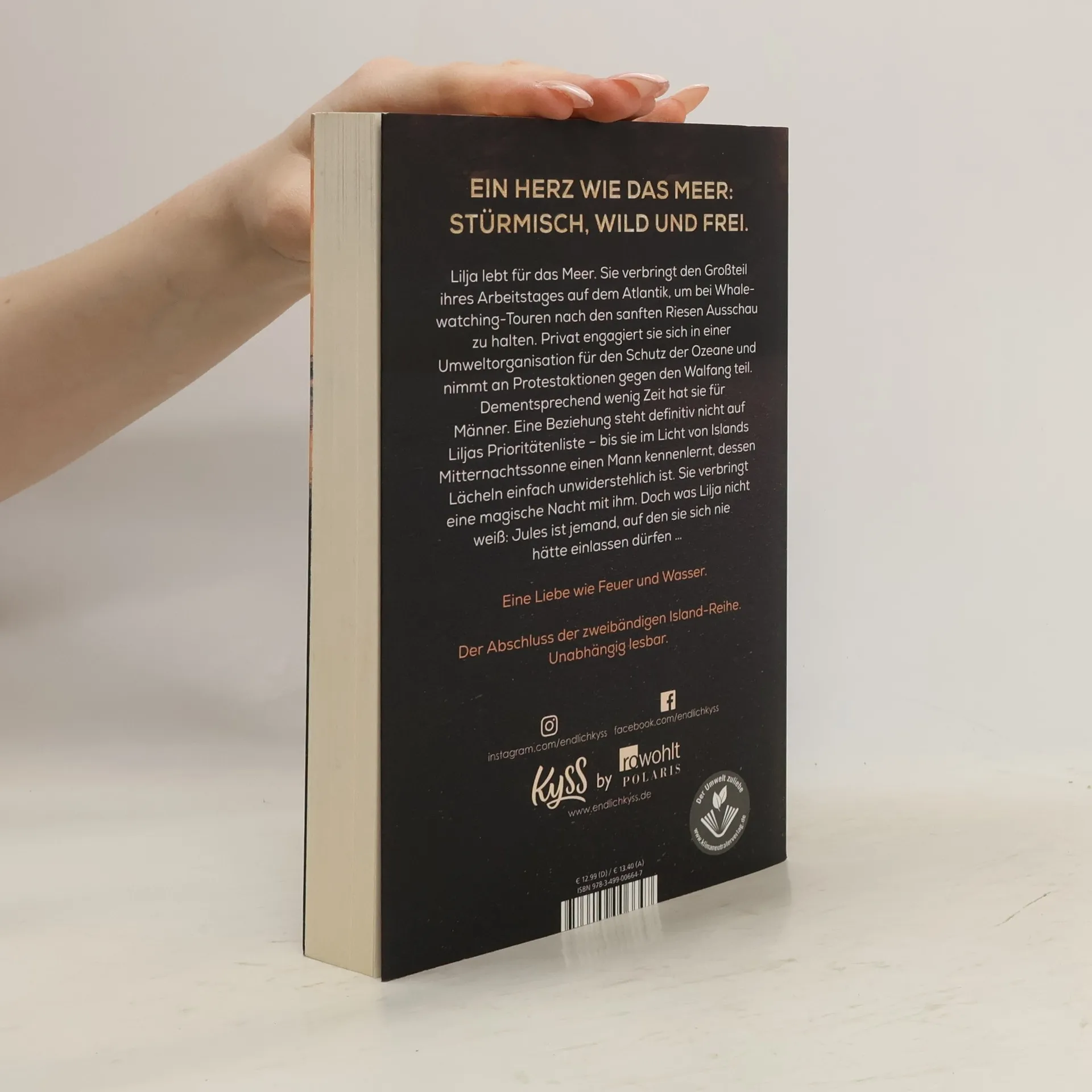 Ein Herz wie das Meer: stürmisch, wild und frei. Lilja lebt für das Meer. Sie verbringt den Großteil ihres Arbeitstages auf dem Atlantik, um bei Whalewatching-Touren nach den sanften Riesen Ausschau zu halten. Privat engagiert sie sich in einer Umweltorganisation für den Schutz der Ozeane und nimmt an Protestaktionen gegen den Walfang teil. Dementsprechend wenig Zeit hat sie für Männer. Eine Beziehung steht definitiv nicht auf Liljas Prioritätenliste – bis sie im Licht von Islands Mitternachtssonne einen Mann kennenlernt, dessen Lächeln einfach unwiderstehlich ist. Sie verbringt eine magische Nacht mit ihm. Doch was Lilja nicht weiß: Jules ist jemand, auf den sie sich nie hätte einlassen dürfen … Mitternachtssonne und Vulkanstrände. Band 2 der Island-Reihe, das Sommerbuch. Unabhängig lesbar.